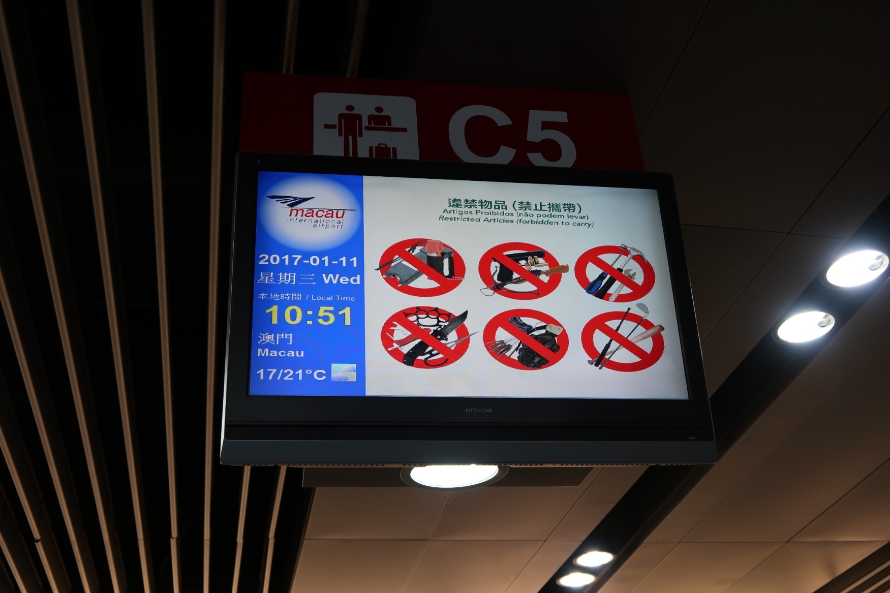 The publicity materials for the security-control items and the dangerous goods at Macau International Airport comprise of three major subjects: 1) the requirements of the carriage of liquids, aerosols and gels, 2) the types of restricted articles and 3) the types of dangerous goods (including the requirements of the carriage of lithium batteries). The information of these subjects is published in printed posters and broadcasted in a video, which are put in the baggage screening area, the check-in counters, the passenger screening area and the boarding gates on the departures level, as well as in the transit corridor and the express link area. The electronic screens at the check-in counters and the passenger screening area are newly adopted for this purpose. The video has been broadcasted in the electronic screens in these areas since mid-December 2016.