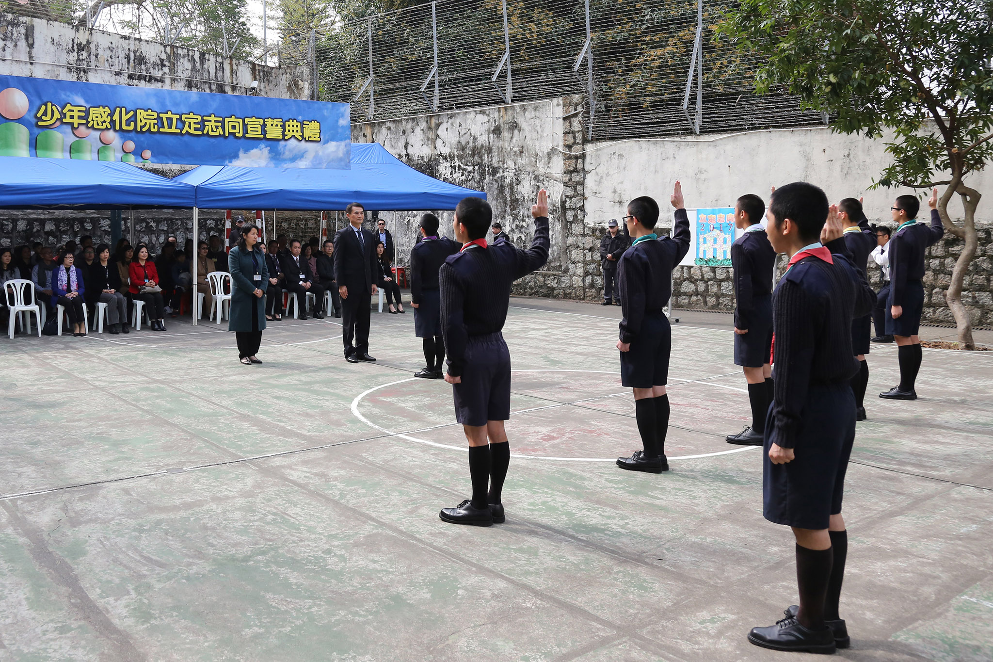 Among the attendees of the event were Judge Shen Li and Judge Leong Mei Ian of the Family and Juvenile Court under the Primary Court; Deputy Director of Education and Youth Affairs Bureau, Kuok Sio Lai; Deputy Director of Social Welfare Bureau, Ao Chi Keong; Secretary General of Caritas Macau, Pun Chi Meng; Chief of Department of Social Reintegration of Social Welfare Bureau, Ip Sio Mei; Principal Ho Im Wa and Deputy Principal Ng Ka Vai of Escola Primária Oficial Luso-Chinesa “Sir Robert Ho Tung”; Deputy Principal of Escola Secundária Luso-Chinesa de Luís Gonzaga Gomes, Ieong Weng Si; Services Officer of Lar de Acolhimento Temporário of Caritas Macau, Ho Kun Lon, as well as all the guardians of the young offenders. During the ceremony, the youngsters, in high spirits, neatly marched into the venue before solemnly and reverently taking the oath, administered by Director of Correctional Services Bureau Cheng Fong Meng and Director of Youth Correctional Institution Yu Pui Lam Ada, and putting up their personal goals as a way to boost their determination in realizing such goals, under the witness of the guests, the counselors of the Institution, as well as their guardians.