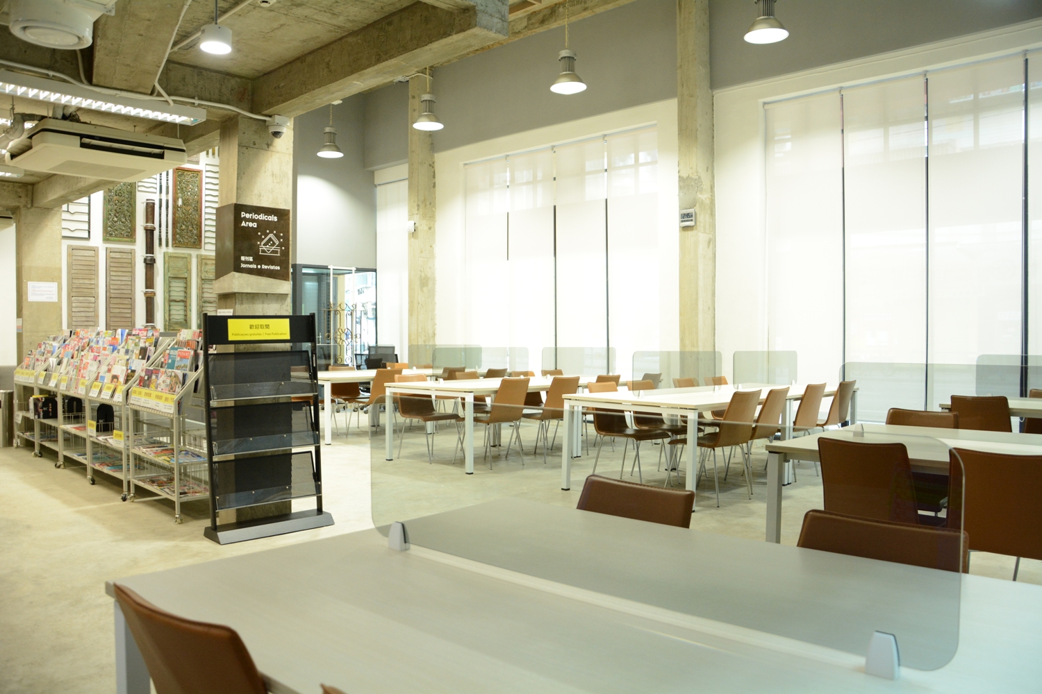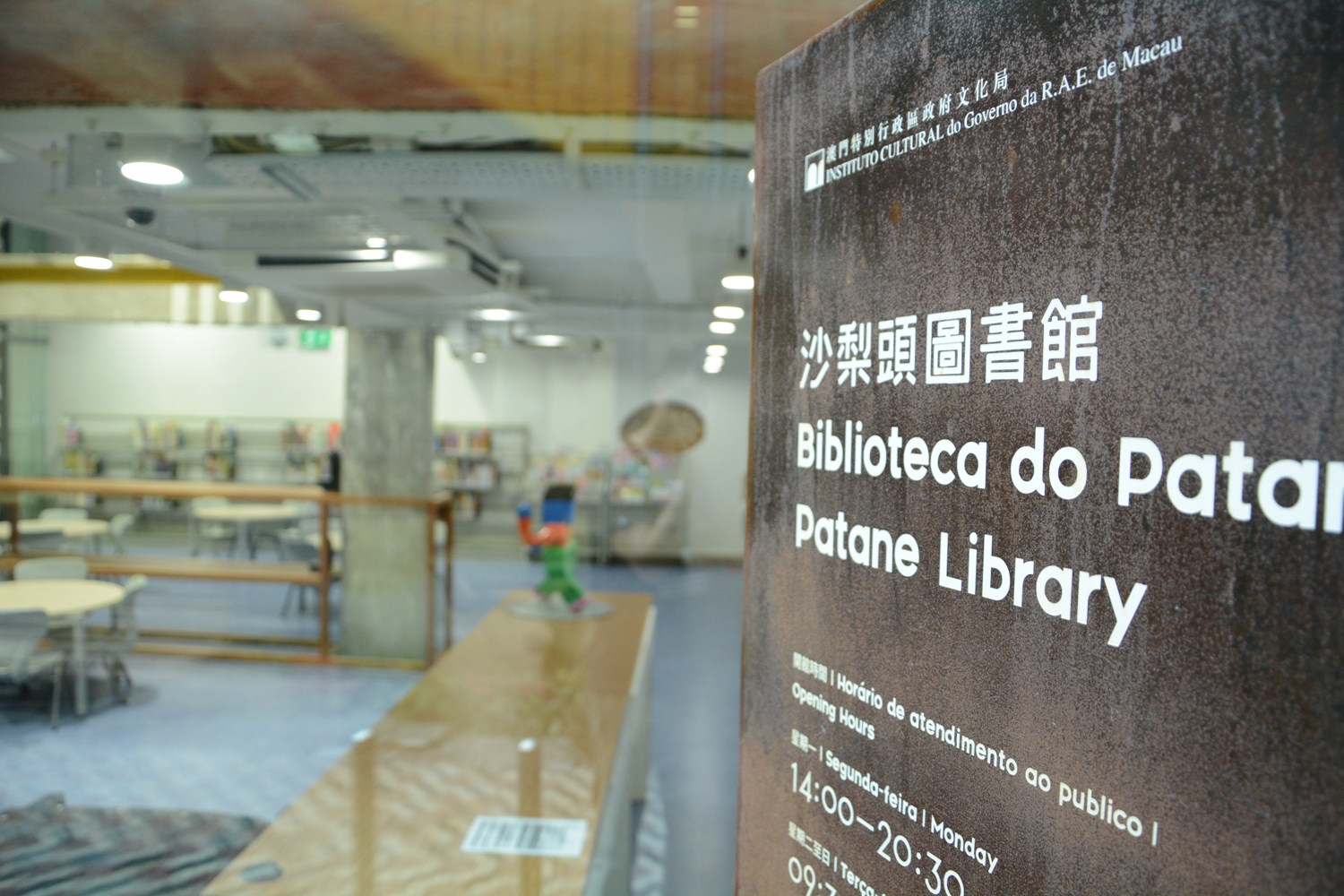 The Patane Library, located at No. 69-81, Rua da Ribeira do Patane, in Macao, covers an area of around 1130m2 distributed by three floors, providing approximately 150 reading seats. In addition to the newspaper and magazine reading services, the Library also provides other services, such as access to the general and children’s collections and lending of audio-visual materials. The Library is open from 2pm to 8:30pm on Mondays, and from 9:30am to 8:30pm from Tuesdays to Sundays, except on public holidays. For enquiries, please contact IC through tel. no. 2825 9220 or 2825 9221, during office hours, or visit the Macao Public Library website at www.library.gov.mo.