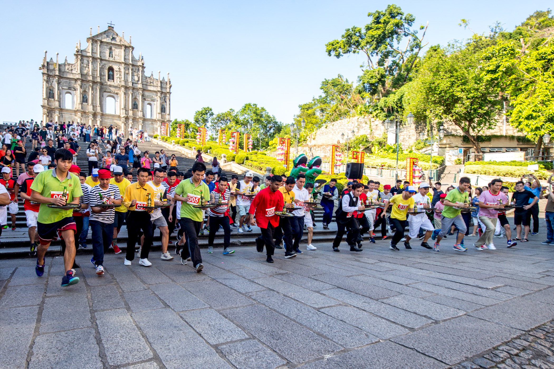Following that, the traditional Tray Race kicked-off in the afternoon. Dressed in special costumes, contestants set off from the Ruins of St. Paul's to wind their way down the lanes amidst the Historic Centre of Macao, each carrying a tray with a bottle of beer, until hitting the finish line at Senado Square the fastest they could with the bottle of beer intact. The Race was filled with fun and excitement, enticing lots of visitors who took pictures and cheered the runners on, while demonstrating the attractiveness of Macao as a tourism city.
