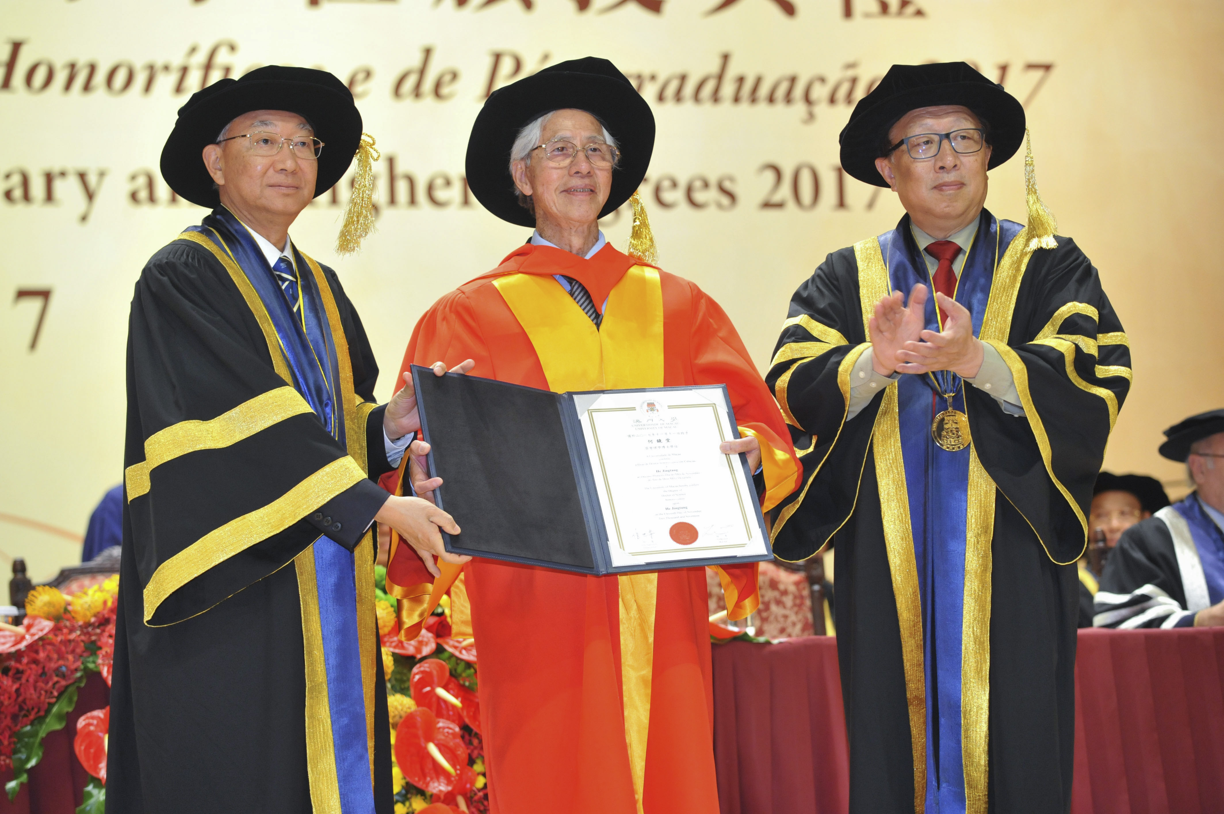 The University of Macau (UM) today (11 November) held the Ceremony for the Conferment of Honorary and Higher Degrees 2017. During the ceremony, the university conferred honorary doctorates on Academician He Jingtang, a representative figure in the Chinese school of architecture; Professor Henry T. Yang, a world-renowned expert in structural engineering; and Professor Binglin Zhong, a well-known educationalist, in recognition of their outstanding achievements and significant contributions to society and education.