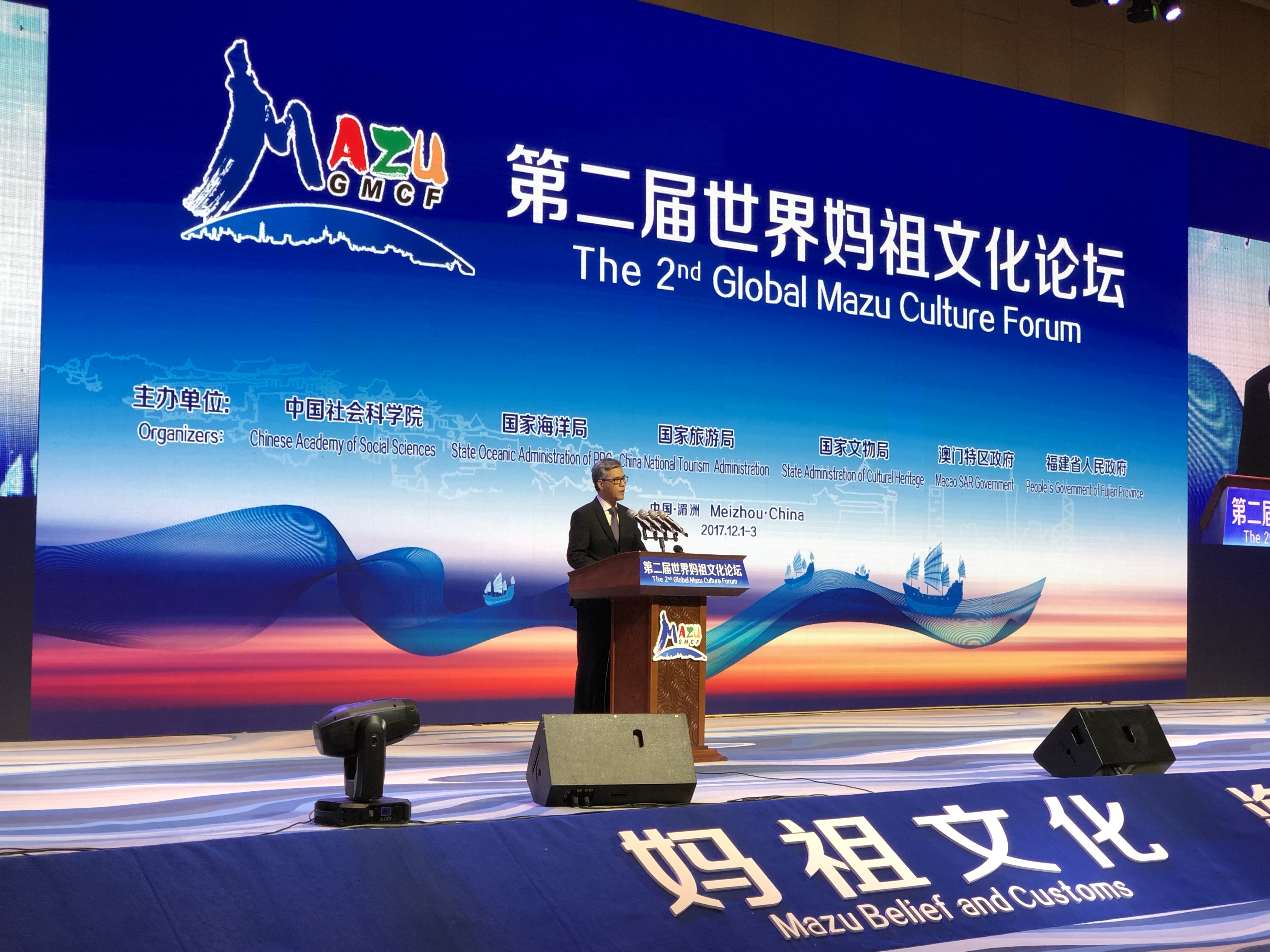 The Global Mazu Culture Forum is jointly organized by Chinese Academy of Social Sciences, State Oceanic Administration, China National Tourism Administration, State Administration of Cultural Heritage, the Macao SAR Government and the People’s Government of Fujian Province. Vice Chairman of Chinese People's Political Consultative Conference, Qi Xuchun, and Vice Governor of Fujian Province, Li Dejin, attended the opening ceremony. The Forum also read out the congratulatory letter from the Chief Executive of the Macao SAR, Chui Sai On. During the opening ceremony, Deputy Director of the State Oceanic Administration, Shi Qingfeng, Deputy Director of the State Administration of Cultural Heritage, Liu Shuguang, Director General of Bureau of International Cooperation of Chinese Academy of Social Sciences, Wang Lei, Chief of Office of the Secretary for Social Affairs and Culture of the Macao SAR Government, Ip Peng Kin, and Deputy Chief of Protocol Division of the Ministry of Foreign Affairs of the Kingdom of Tonga, Curtis Leonard Tu’ihalangingie, delivered their keynote speeches.