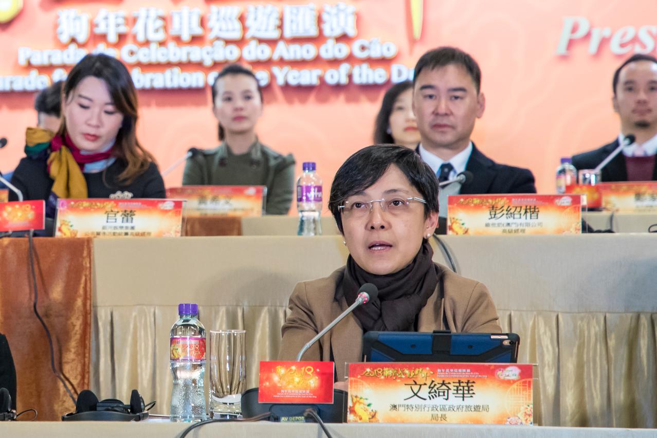 The “Parade for Celebration of the Year of the Dog” is organized by MGTO and co-organized by Civic and Municipal Affairs Bureau, Sports Bureau and Cultural Affairs Bureau, as well as supported by China National Tourism Administration as one of the sponsoring entities. A press conference for the event was held at the Macau Tower Convention and Entertainment Center today (31 January). MGTO Director Maria Helena de Senna Fernandes, Deputy Director Cheng Wai Tong, Head of Department of Civic Affairs and Consultation of Civic and Municipal Affairs Bureau, Patsy Ko Pui San, Head of Sports Facilities Management Department of Sports Bureau, Ho Wa, and Acting Head of the Department of Performing Arts Development of Cultural Affairs Bureau, Iu Wai Man, were present in the press conference along with representatives of the supporting and sponsoring entities.