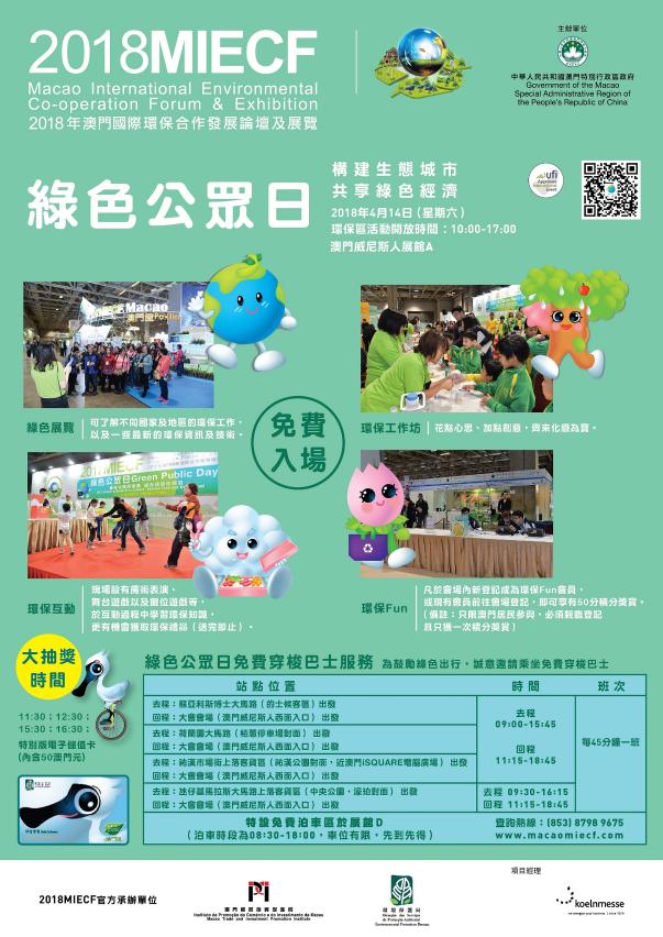 The ongoing 2018 Macao International Environmental Co-operation Forum & Exhibition (2018MIECF) is not only an international green platform enabling those in the environmental protection industry to exchange information and search for business opportunities, but also has a role as a public educational resource. The 2018MIECF event promotes community participation via “Green Public Day” on its final day (14 April) when the public can visit the “Green Showcase” exhibition floor, thus enhancing their awareness of environmental protection. All are welcome.