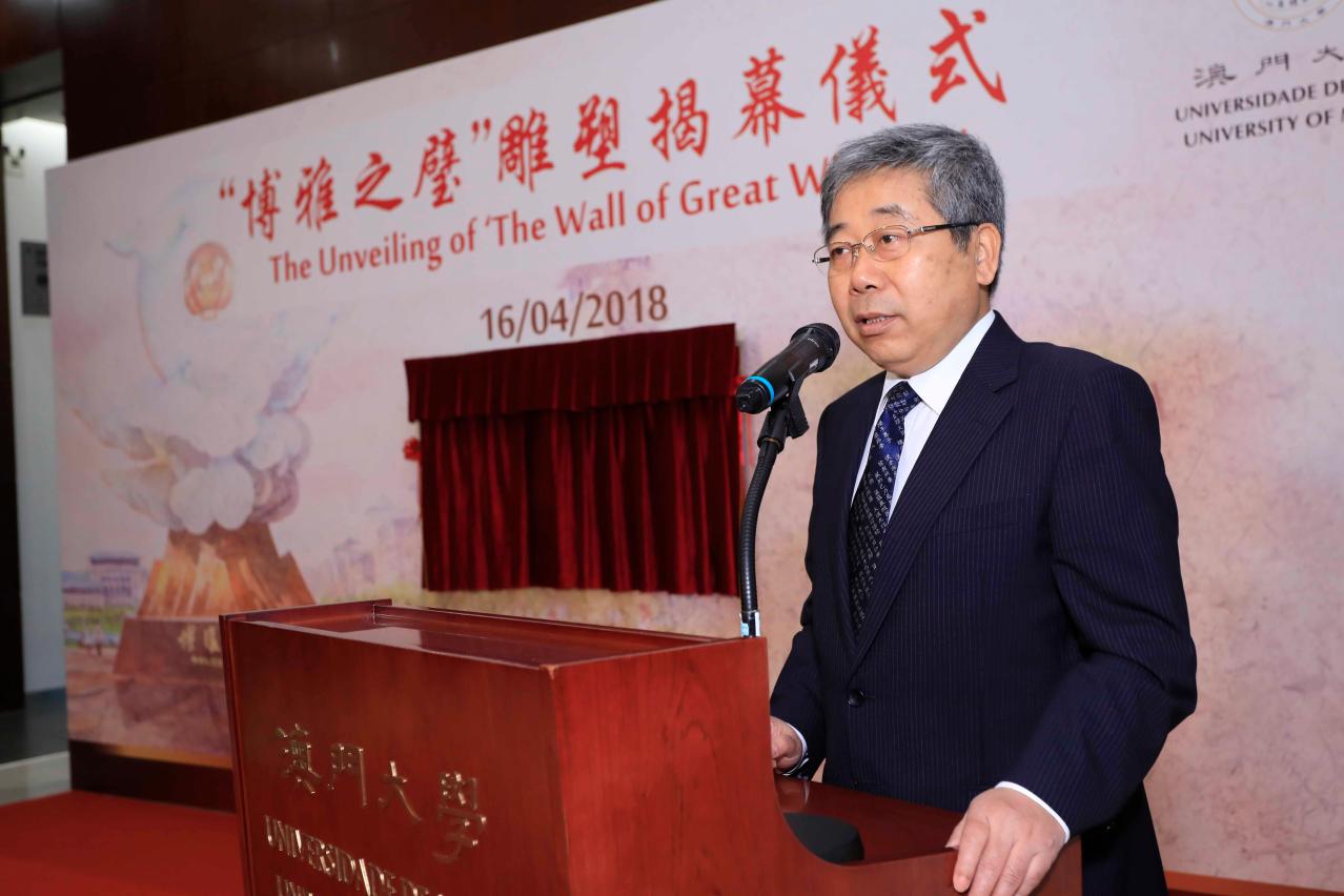 Chen Baosheng said that with the new campus ushering in a new era for UM, the Wall of Great Wisdom represents new requirements for UM members. It is more than a gift from the Ministry of Education; it reflects high expectations from the central government. The first Chinese character in the name of the gift, Bo, conveys the hope that UM faculty and students will strive to be knowledgeable and broad-minded. The second Chinese character, Ya, conveys the hope that UM members will cultivate refined behaviour and healthy hobbies. The two provide internal and external impetus for personal growth and are part of the guiding principles for educational development in China. The last Chinese character in the name, Bi, means an instrument used in ancient China for sacrificial purposes. It can be considered a carrier of the Chinese culture. Today, the Wall of Great Wisdom was gifted to UM by the Ministry of Education. It is expected to turn a new page in the university’s history. It is hoped that by understanding the profound historical meanings associated with the Chinese name of the gift, UM will be motivated to fulfil its historical mission to produce exemplary graduates who can serve the country, contribute to the rejuvenation of the Chinese nation, and support the long-term prosperity and stability of Macao. It is also hoped that the university will develop into a renowned institution both in China and in the world.