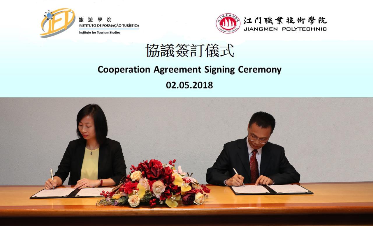 Institute for Tourism Studies (IFT) and Jiangmen Polytechnic signed a cooperation agreement at IFT on 2 May. President of IFT, Dr. Fanny Vong and President of Jiangmen Polytechnic, Dr. Liu Zhi Yong presided over the ceremony. Representatives from Jiangmen Tourism Bureau, Guangdong Province are also invited to attend the signing ceremony.