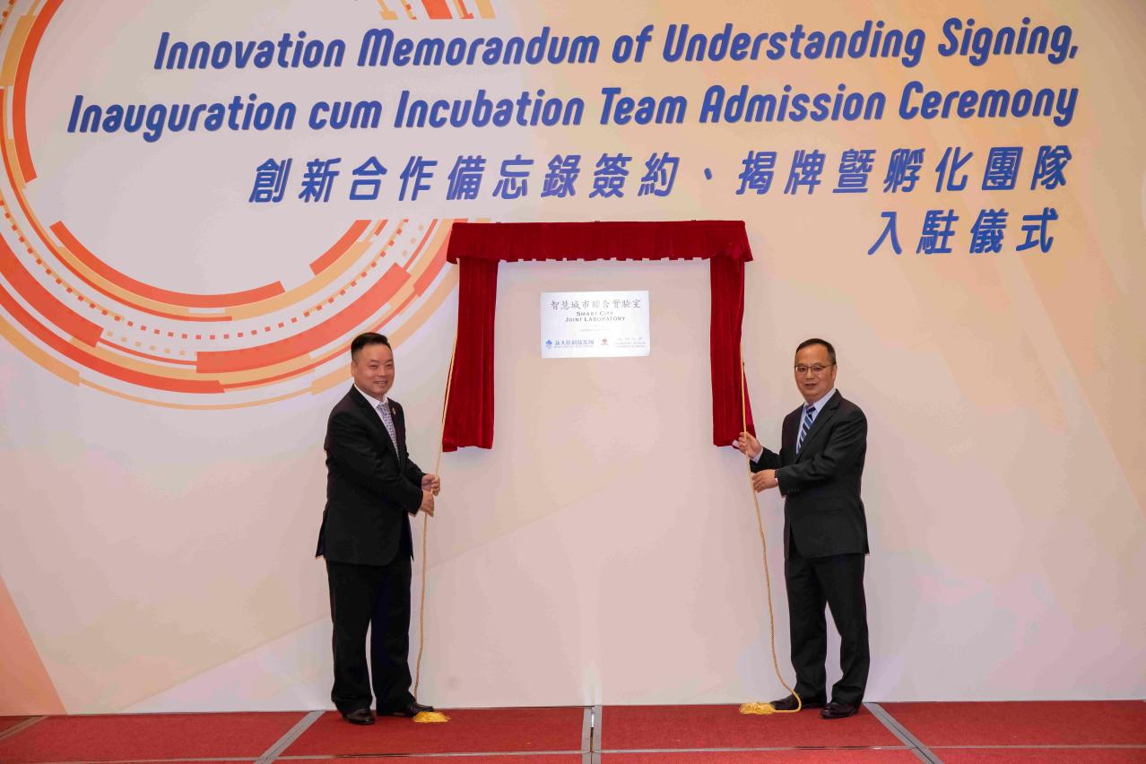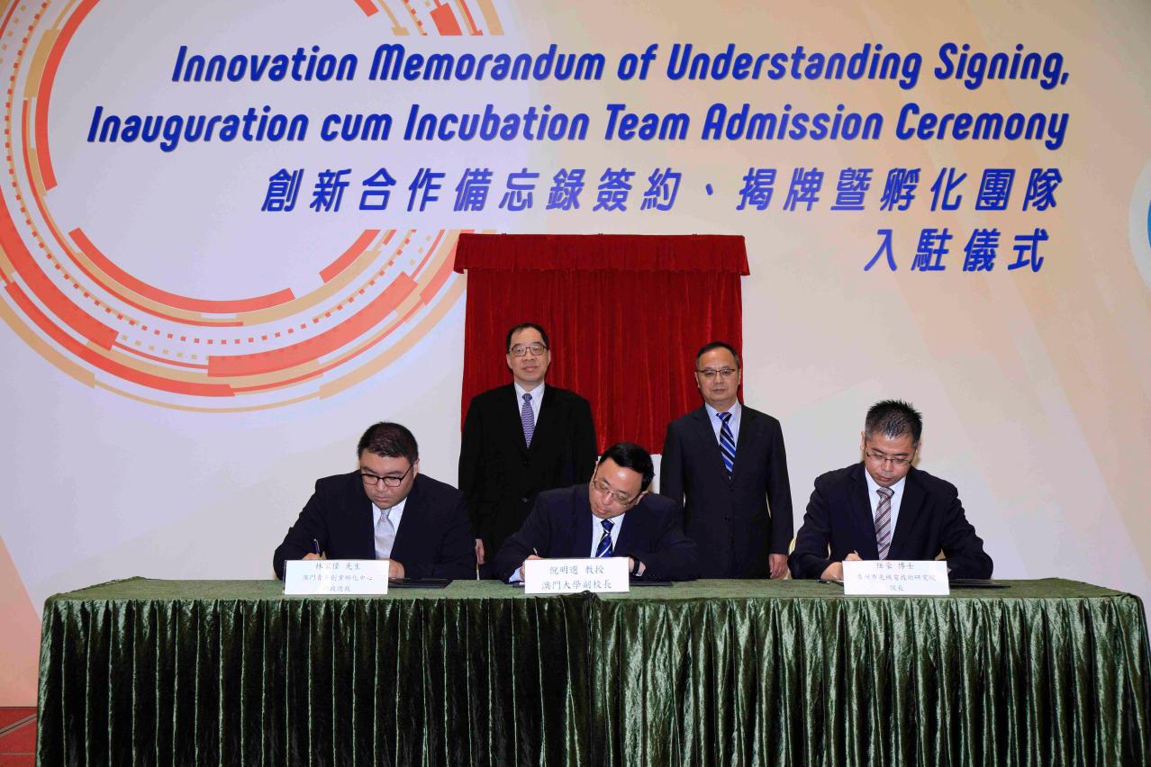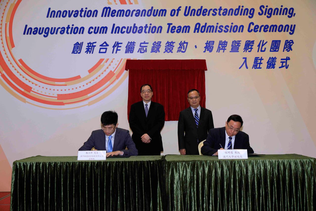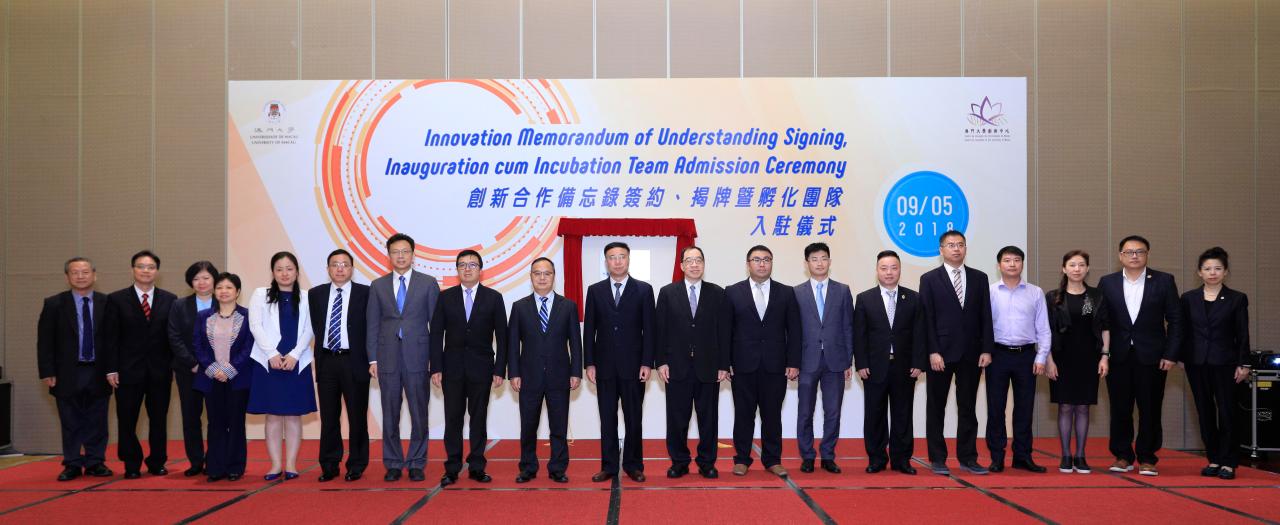 The University of Macau (UM) Centre for Innovation today (9 May) signed a memorandum of understanding (MOU) with companies and government departments on collaborations to promote the development of an ecosystem for innovation and entrepreneurship. At the same event, UM held an inauguration ceremony for its Smart City Joint Laboratory and an admission ceremony for teams selected to join the Centre for Innovation for business incubation. Prominent community members, industry representatives, experts, scholars, UM faculty members, and the media attended the event to learn more about the development and technology transfer of research results as well as the university’s breakthroughs in knowledge and technological innovations.
