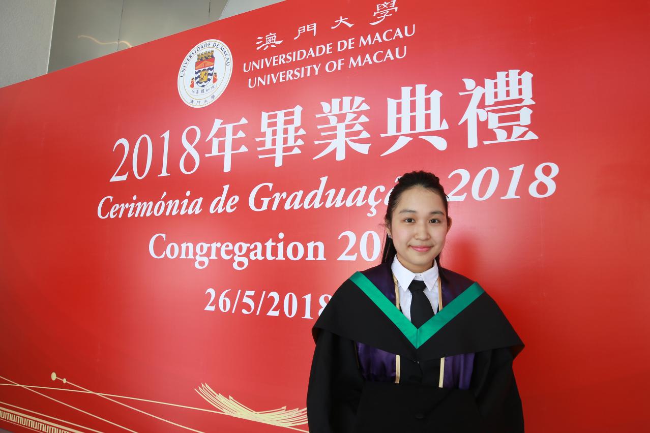Ieong Un Si from the Department of Government and Public Administration, who was admitted to UM on the recommendation of her secondary school principal, received the Macau Foundation Academic Prize. ‘UM provides a lot of academic resources and an exchange platform for me and other students. In the Honours College (HC), I was able to meet many outstanding and like-minded students from various faculties,’ says Ieong. ‘Through the HC, I had the opportunity to participate in an exchange trip to the University of Illinois Urbana-Champaign in the United States for a semester.’ Ieong discloses that she will study for an MSSc Programme in Public Policy at the Chinese University of Hong Kong starting this September and she hopes to give back to society with what she learns.