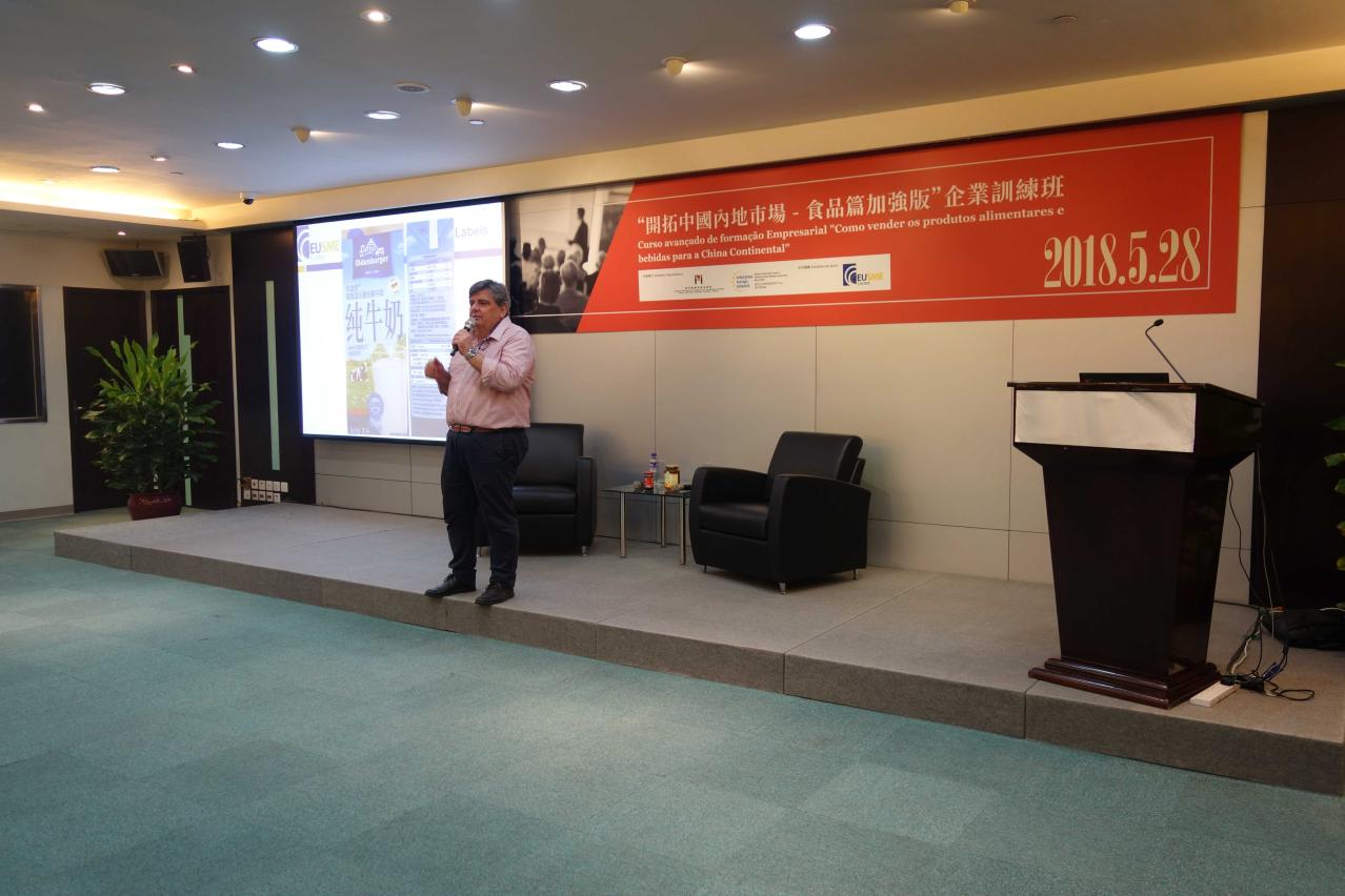 In order to enhance the development of Macao as the commercial and trade co-operation service platform between China and Portuguese-speaking countries, particularly, as a distribution centre for food of Portuguese-speaking countries among the “three centres”, and assist the food brands from Portuguese-speaking countries and Macao food enterprises to open up the huge consumer market in Mainland China, the Enterprise Training on “How to Sell Food & Beverage Products to China” which is jointly organised by the Macao Trade and Investment Promotion Institute (IPIM) and the Macao office of Enterprise Europe Network Central China (EENCC Macao), and supported by EU SME Centre was held today (28th) at the Multi-Functional Conference Hall of IPIM on the 19th floor of Edificio China Civil Plaza. The training attracted more than 100 representatives of local chambers of commerce and enterprises.