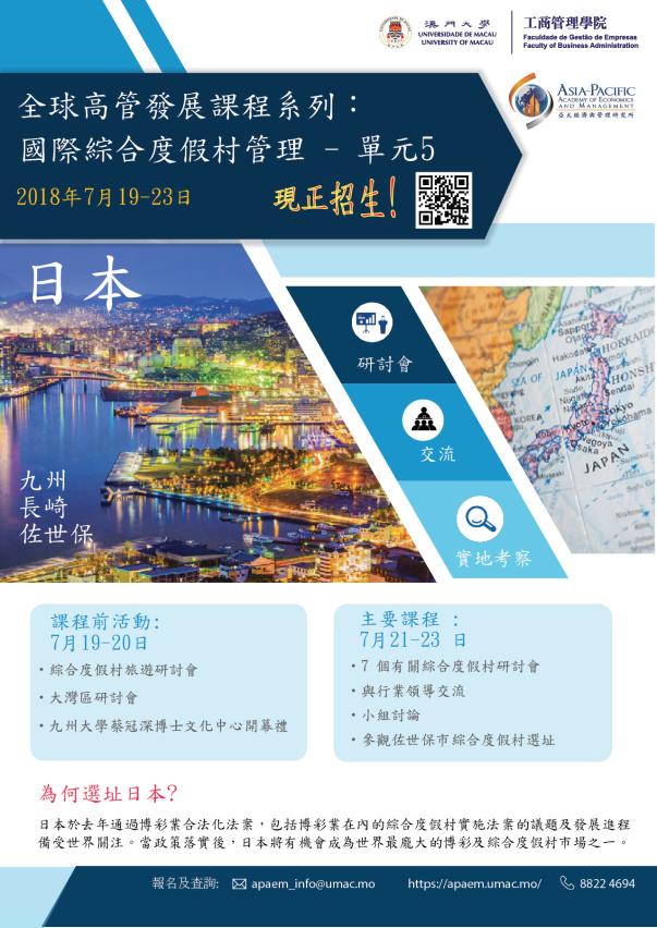 Enrollment is now open for the fifth module of the Global Leadership Development Programme Series: International Integrated Resort Management, which is jointly organised by the University of Macau’s (UM) Asia-Pacific Academy of Economics and Management (APAEM) and Faculty of Business Administration (FBA). The programme will take place in Kyushu and Nagasaki, Japan, from 21 July to 23 July. Scholars and industry experts from Macao and Japan will give lectures and exchange ideas with the participants during the programme. Industry practitioners are welcome to enroll for the programme.