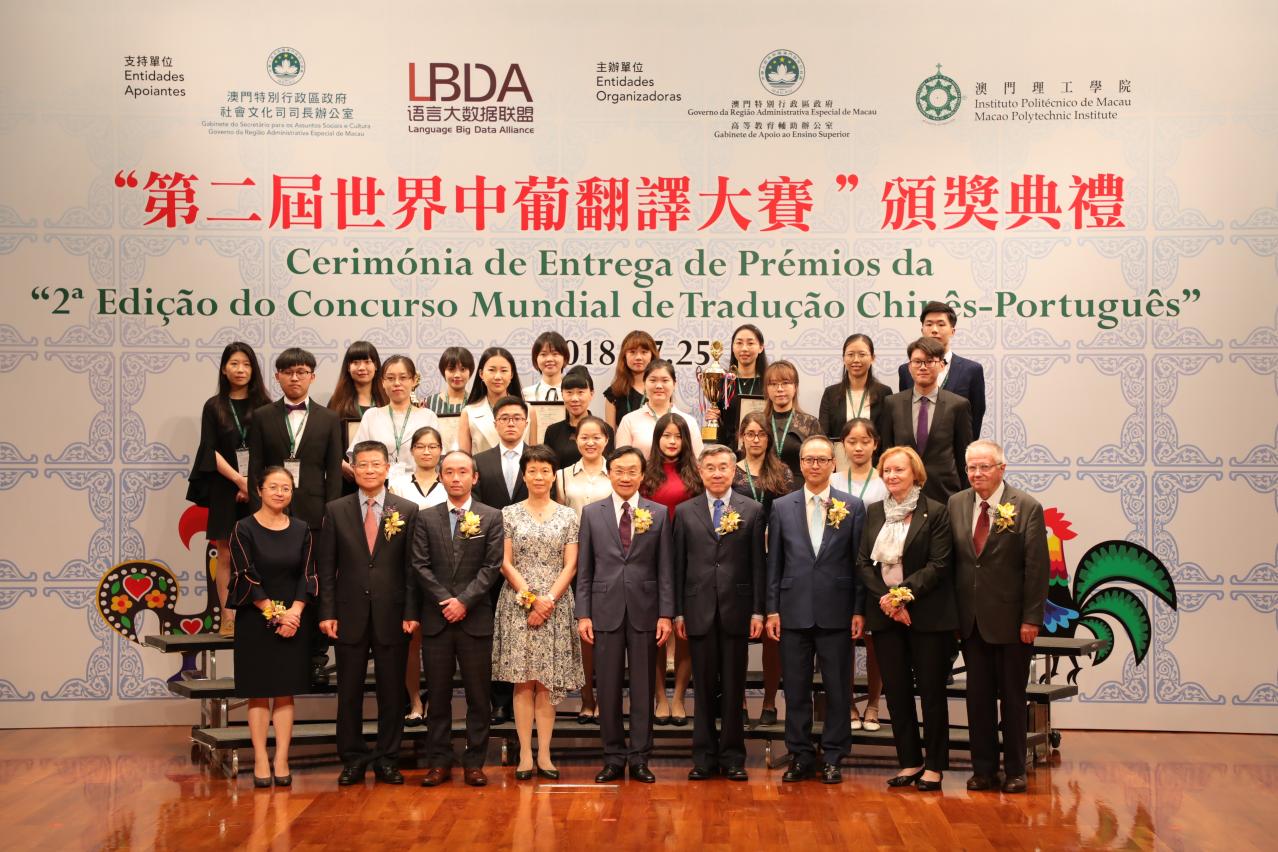 Supported by the Secretary for Social Affairs and Culture of the Macao SAR Government and the Language Big Data Alliance (LBDA), jointly organized by the Tertiary Education Services Office and MPI, the awards ceremony of the “2nd World Chinese-Portuguese Translation Competition” was successfully held at the Auditorium of MPI at 16:30 on 25 July. Guests officiating at the ceremony included Dr. Alexis Tam (Secretary for Social and Cultural Affairs of the Macao SAR); Ms. Xu Ting, (Director of the Department of Culture and Education of the Liaison Office of the Central People’s Government in the Macao SAR); Professor Huang Youyi (Executive Vice President of the Translators Association of China, former Deputy Director-general of China Foreign Languages Publishing Administration); Mr Manuel Ricardo da Silva (Acting Consul-General of Portugal in Macao and Hong Kong); Mr. Sou Chio Fai (Director of the Tertiary Education Services Office of the Macao SAR); Professor Lei Heong Iok (President of MPI); Professor Hannelore Lee-Jahnke (Honorary President of the International Standing Conference of the University Institutes of Translators and Interpreters (CIUTI)); Professor Martin Fostner (former President of CIUTI) and Ms. Zhang Xiaodan (Deputy General Manager of Global Tone Communication Technology Co. Ltd). Around two hundred guests as well as representatives of participating teams together with their teachers attended the ceremony.