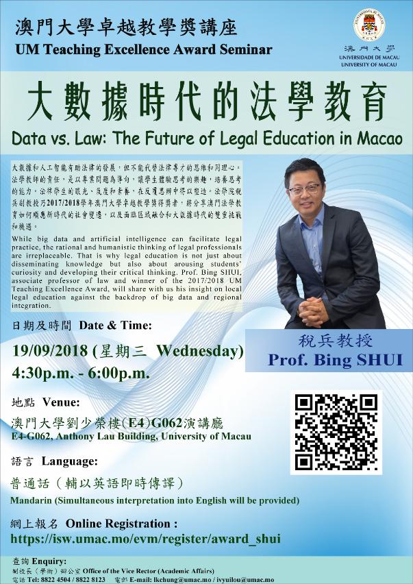 The University of Macau (UM) on 19 September (next Wednesday) will hold a talk titled ‘Data vs Law: The Future of Legal Education in Macao’. Prof Shui Bing from the Faculty of Law, who is the recipient of the Teaching Excellence Award for the 2017/2018 academic year, will be the keynote speaker. During the talk, Prof Shui will share his insights on how legal education in Macao keeps pace with social changes amid the challenges and opportunities brought about by regional integration and the big data era. All are welcome.