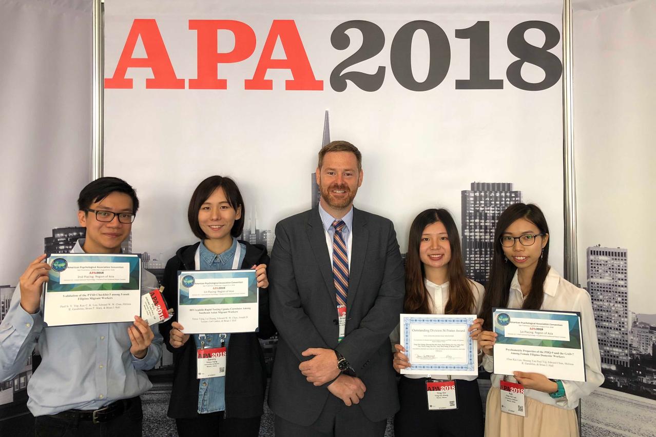 Four students from the Department of Psychology, Faculty of Social Sciences, University of Macau (UM), won best student poster awards for their senior honours thesis poster presentations at the 2018 Convention of the American Psychological Association (APA), one of the oldest and most respected psychology associations in the world. This is the first time undergraduate students from UM’s Department of Psychology have received the best student poster awards from the APA convention, the largest annual conference in the field of psychology. The students’ supervisor is Prof Brian Hall from the same department. The poster presentations are part of Prof Hall’s ongoing public health research programme in Macao, and all the projects and data originated in Macao.