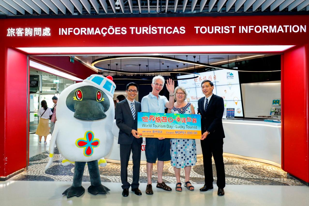 MGTO Deputy Director Cheng Wai Tong and Ricky Hoi together with other MGTO officials arrived at the Outer Harbour Ferry Terminal this morning to present welcome souvenirs to the Lucky Tourist on the World Tourism Day. Greeted also by the Macao Tourism Mascot “MAK MAK”, the Lucky Tourist of this year is David Clark from the United Kingdom, who is traveling to Macao and other destinations in one trip with his wife Janet Stopher Clark as independent visitors. Thrilled to become the Lucky Tourist of the year, David shared that he had been to Portugal before and planned to visit the quaint architectures in Macao on this trip besides enjoying a taste of Portuguese cuisines and egg tarts here, as well as one of the famous large-scale singing and dance performances tonight. In addition, souvenirs were distributed to visitors at MGTO’s Tourist Information counters throughout the day.