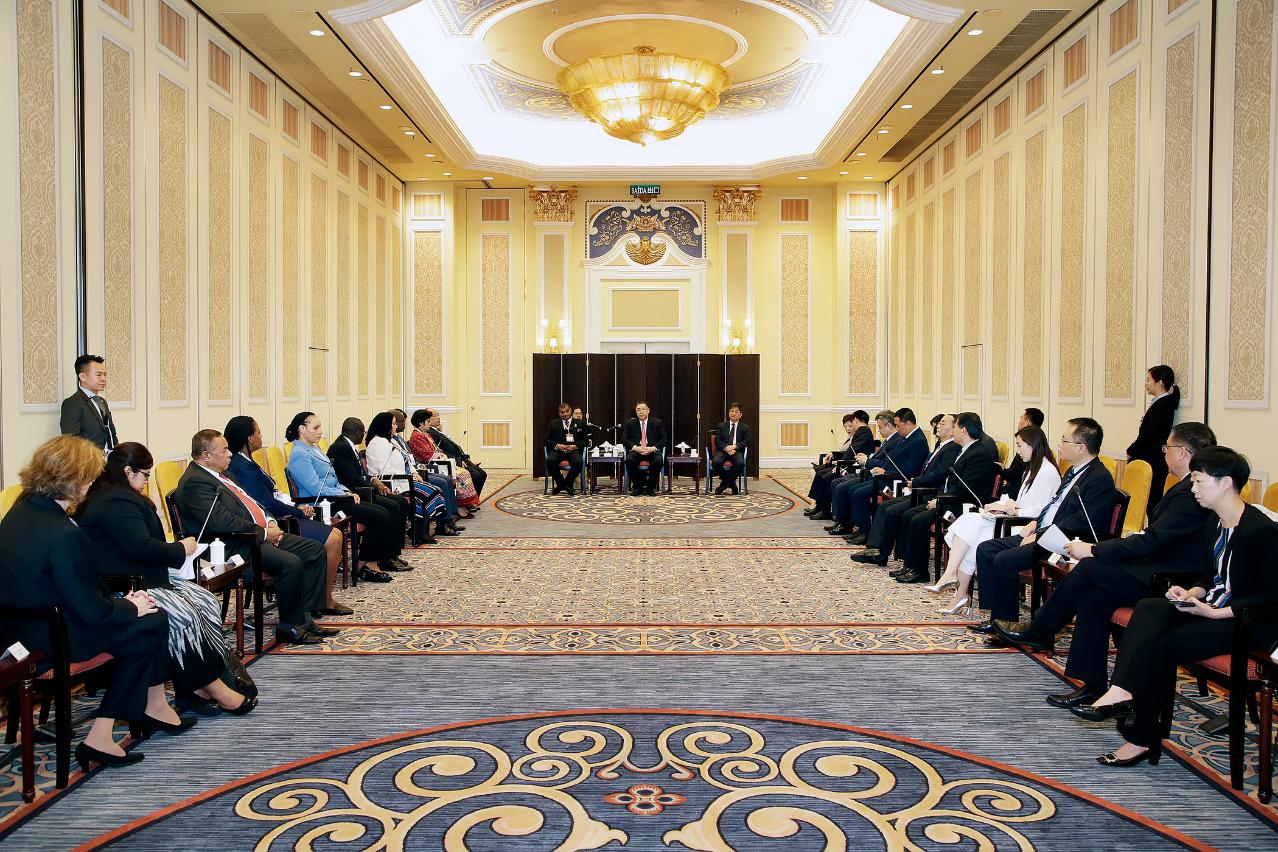 Other officials joining the meeting included representatives respectively from Jiangsu Province; the State Ethnic Affairs Commission; the China Council for the Promotion of International Trade; the Government of the Republic of the Union of Myanmar; the Consulate General of Myanmar in Hong Kong; and the Consulate General of Portugal in Macao and Hong Kong; and ambassadors to China from respectively, Angola, Cabo Verde, Guinea-Bissau, Mozambique, São Tomé and Príncipe, and Timor-Leste.