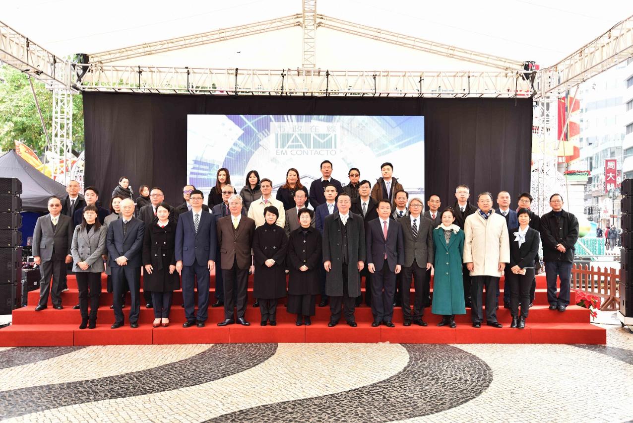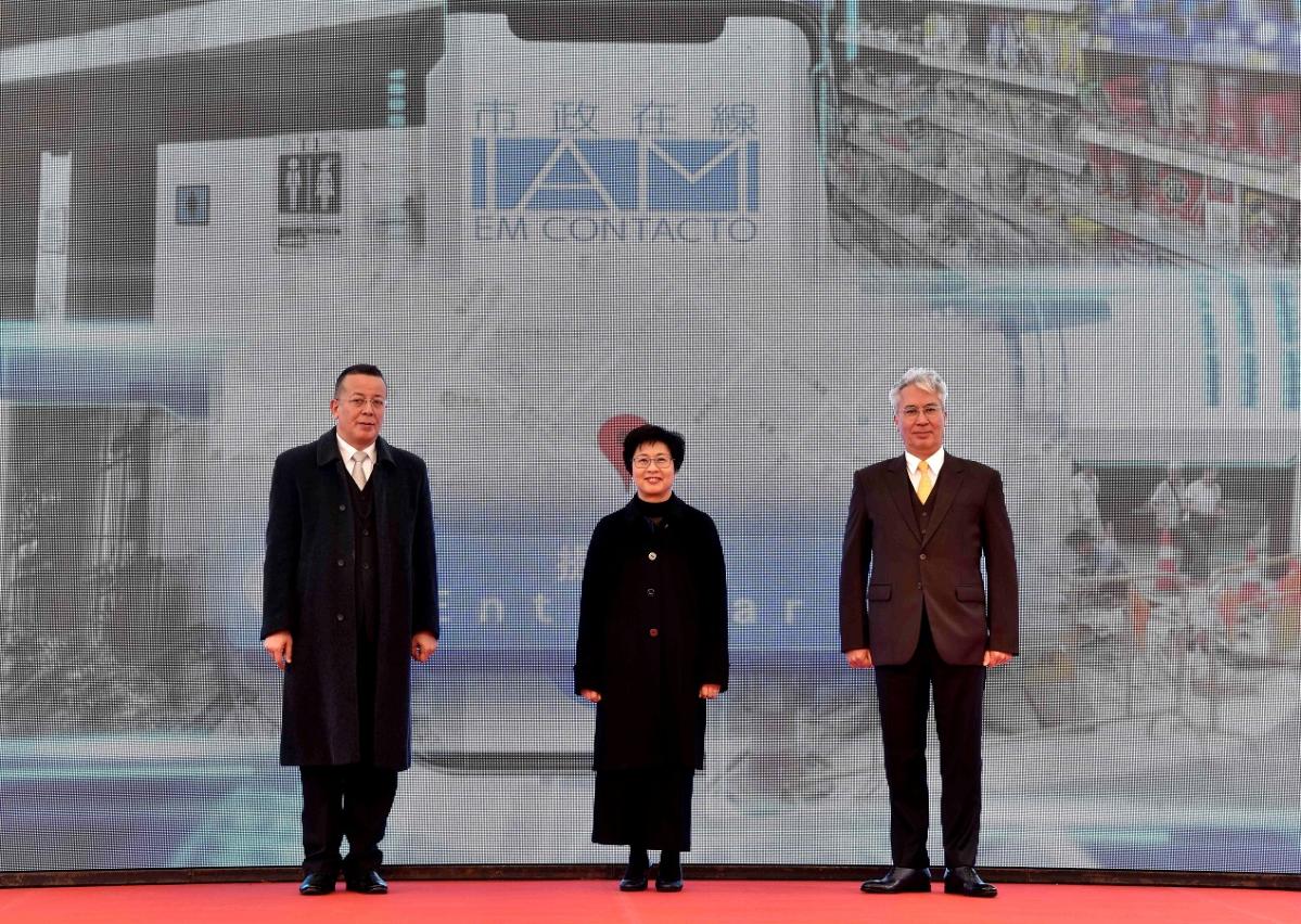 The launch ceremony of “IAM connect” was held in Senado Square. Attendees of the ceremony include Secretary for Administration and Justice, Ms Chan Hoi Fan, Chief of Office of the Secretary for Administration and Justice, Ms Iao Man Leng, Chairman of Administration Committee on Municipal Affairs of IAM, Mr José Tavares, Vice Chairmen of Administration Committee on Municipal Affairs of IAM, Mr Lei Wai Nong and Mr Lo Chi Kin, Members of Administration Committee on Municipal Affairs of IAM, Ms Isabel Celeste Jorge, Mr Ma Kam Keong, Mr Mak Kim Meng, Ms Ung Sau Hong and Ms To Sok I; the newly appointed Chairman of Consultative Committee on Municipal Affairs, António José Dias Azedo, and Vice Chairman of Consultative Committee on Municipal Affairs, Chong Coc Veng; Chairwoman of Financial and Property Supervisory Committee of IAM, Ms Iong Weng Ian, along with Members of Consultative Committee on Municipal Affairs.