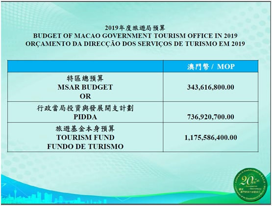 Macao Government Tourism Office (MGTO) held the Annual Press Conference yesterday (23 January) and unveiled the budget of the Office. Since the data shown on the slide “Budget of Macao Government Tourism Office in 2019” of the PowerPoint file is in fact the final budget in 2018, the Office now provides the budget of the Office in 2019 for reference.