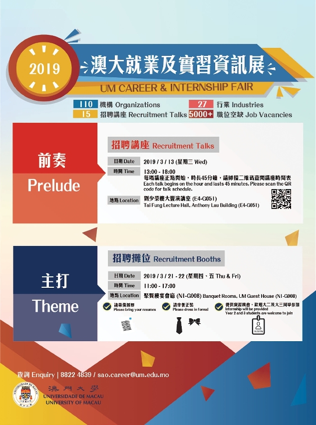 Those who are interested are encouraged to attend the fair in formal attire to seek career opportunities. For enquiries, please call 8822 4839 or email to sao.career@um.edu.mo.