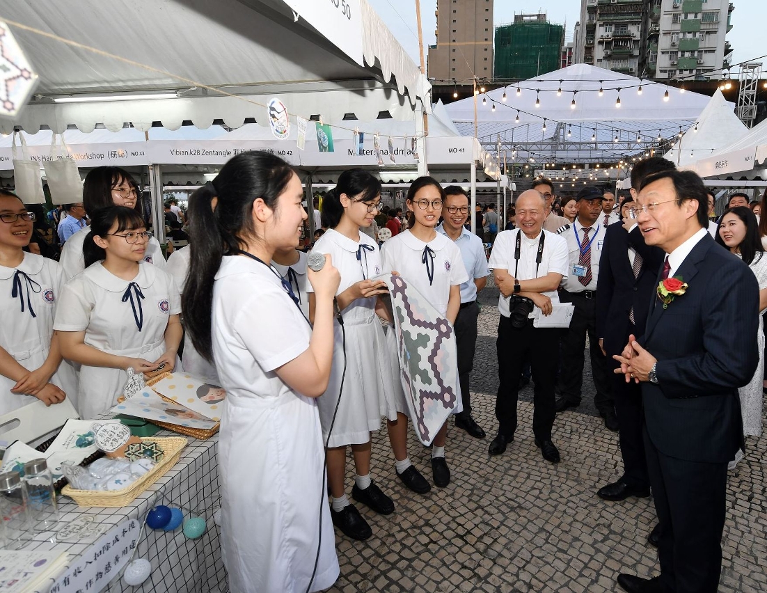 The opening ceremony of the “Tap Siac Craft Market” was held on 26 April at 6:15pm at Tap Siac Square and was officiated by the Secretary for Social Affairs and Culture of the Macao SAR Government, Alexis Tam Chon Weng; the Director of the Department of Publicity and Culture of the Liaison Office of the Central People’s Government in the Macao SAR, Wan Sucheng; the President of the Cultural Affairs Bureau, Mok Ian Ian; the Vice President of the Committee of Cultural Industries, Hsu Hsiu-Chu; the Member of the Administrative Committee of the Cultural Industries Fund, Chu Miu Lai; the Chief of the Division of Cultural, Recreational and Association Affairs of the Department of Cultural and Recreational Affairs and Civic Education of the Municipal Affairs Bureau, Au Chan Weng; the Supervisor of the Boys’ & Girls’ Clubs Association of Hong Kong, Wong Mei Ling; the Founder of CAMPOBAG in Taiwan, Chen Jing Ting; and the Project Manager of The Life Guangzhou, Sarah Nie.