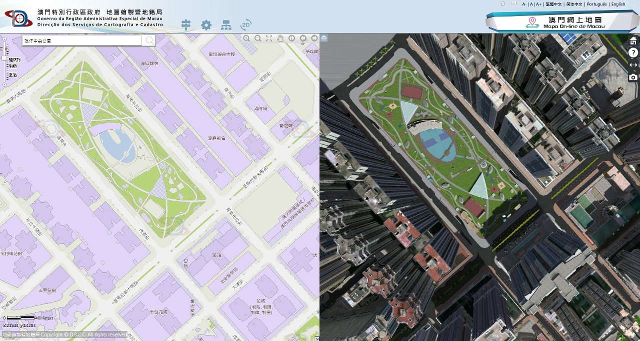 According to《The Five-Year Development Plan of the Macao Special Administrative Region (2016-2020) 》, to tie in with the development of smart city and the implementation of the three-dimensional map application, Cartography and Cadastre Bureau (DSCC) launches the 3D Map function on the basis of the “Macao Online Map” platform, which allows public to navigate the 3D scenes of Macao in a visual and multi-angles way and see the city's landscapes without going out.