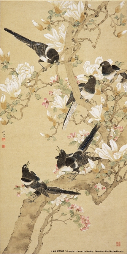 Chen paid much attention to the use of colour and composition to give brightness, clarity, elegance and gentleness to his bird-and-flower paintings with a decorative touch, paving a new way for the development of this noble traditional art. In Magpies and Magnolias, Chen took the jubilant connotation of a magpie to express his lavish praise and timeless sentiments for his motherland. The auspicious atmosphere is visualised through the abundant objects painted with bright and elegant tones of colour, and with techniques representing a harmonious union of both the tangible and intangible, the far and the near, while clearly depicting what is primary and secondary.
