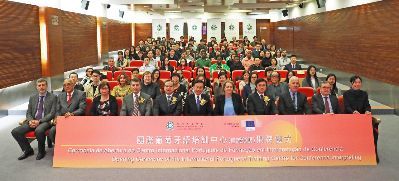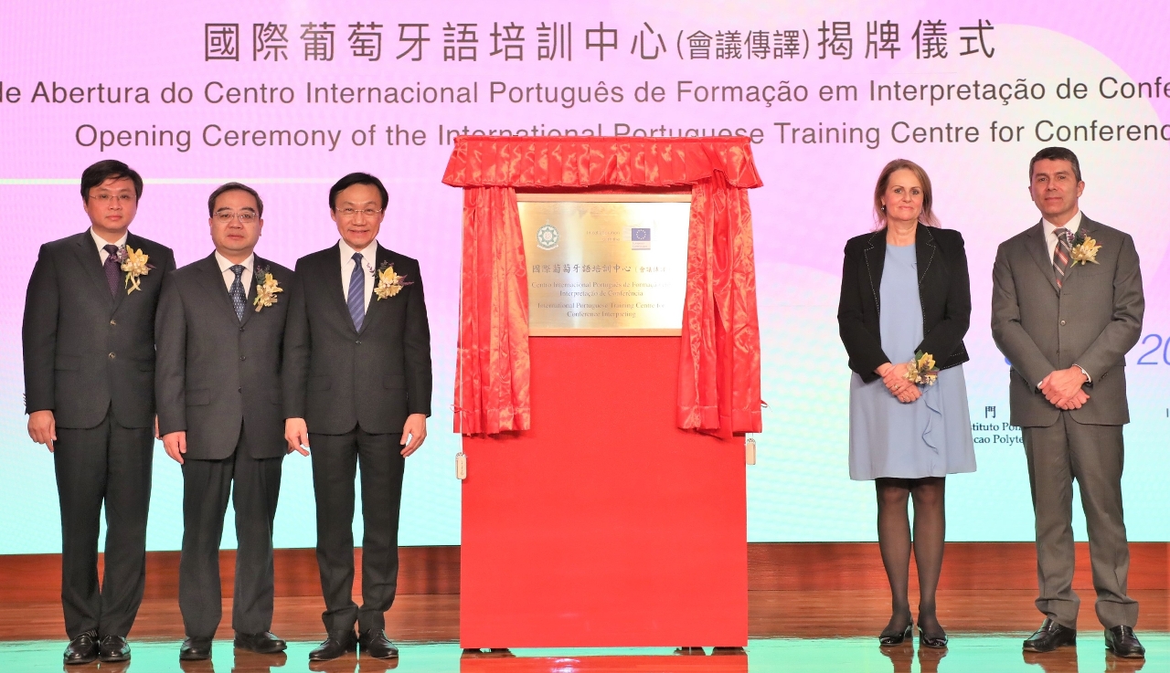 On the occasion of the 70th anniversary of the founding of the People's Republic of China, the 20th anniversary of the establishment of the Macao Special Administrative Region and the 40th anniversary of the establishment of diplomatic relations between China and Portugal, the Macao Polytechnic Institute (MPI) officially opened the International Portuguese Training Centre for Conference Interpreting on December 5, 2019. Based on the long-term friendly cooperation with the Directorate General for Interpretation of the European Commission (DG-SCIC), the Centre will further consolidate Macao's role as a service platform for business cooperation between China and Portuguese-speaking countries, improve the training effectiveness of both local and overseas Portuguese-speaking talents, strengthen the cooperation between Macao and other regions in cultivation of Portuguese-speaking talents, and raise the quality of the related human resources. Alexis Tam, Secretary for Social Affairs and Culture of the Macao Special Administrative Region Government, Gou Renmin, Deputy Director-General of the Department of Education and Youth Affairs of the Liaison Office of the Central People’s Government in the Macao Special Administrative Region, Florika Fink-Hooijer, Director General of DG-SCIC of European Commission, Paul Cunha Alves, Consul-General of Portugal in Macao, and Marcus Im Sio Kei, President of MPI, presided over the opening ceremony.