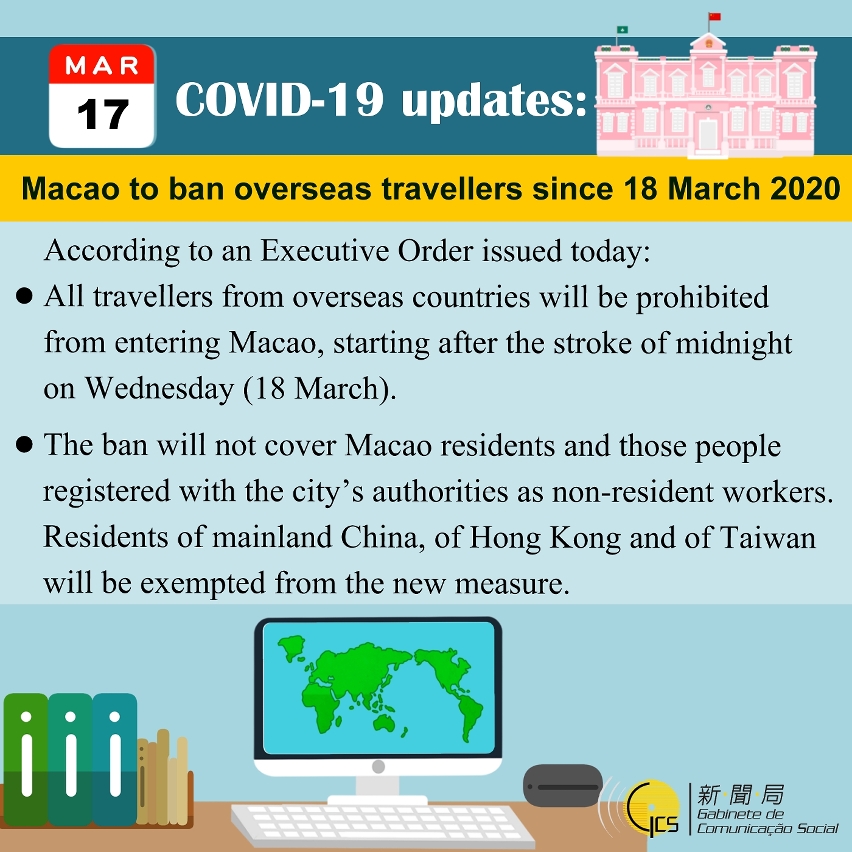 All travellers from overseas countries will be prohibited from entering Macao, starting after the stroke of midnight on Wednesday (18 March).
