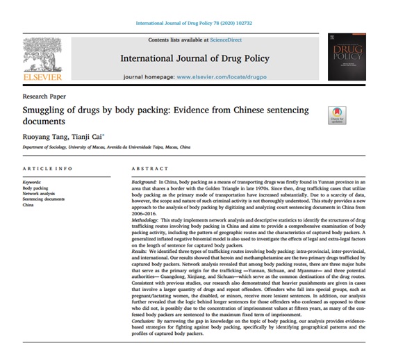 A research article titled ‘Smuggling of Drugs by Body Packing: Evidence from Chinese Sentencing Documents’, co-authored by Tang Ruoyang, a PhD candidate in the Department of Sociology, University of Macau (UM), and her supervisor, Cai Tianji, an associate professor in the same department, has been published in International Journal of Drug Policy, a leading journal in the field of substance abuse.