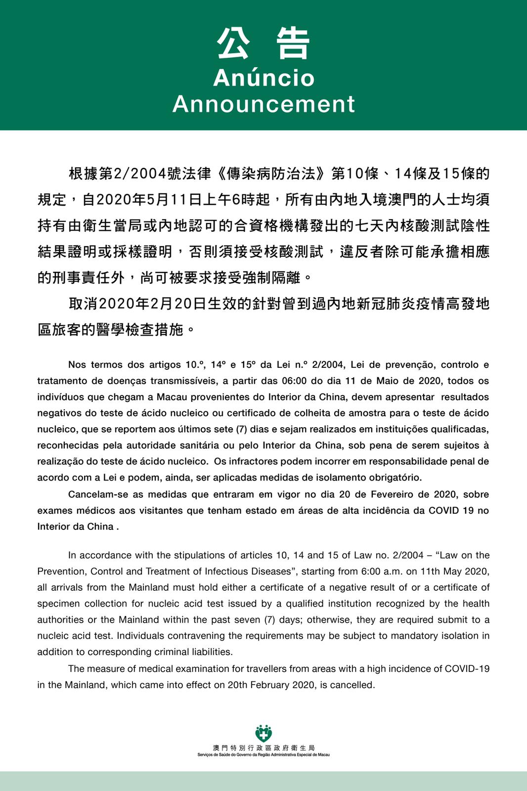 2) They must have a certificate confirming a negative result from a nucleic acid test for the COVID-19 infection, and such a test result must have been conducted and confirmed either by the Macao health authorities or a recognised health institution in Zhuhai, within seven days of the person’s intended journey to Macao;