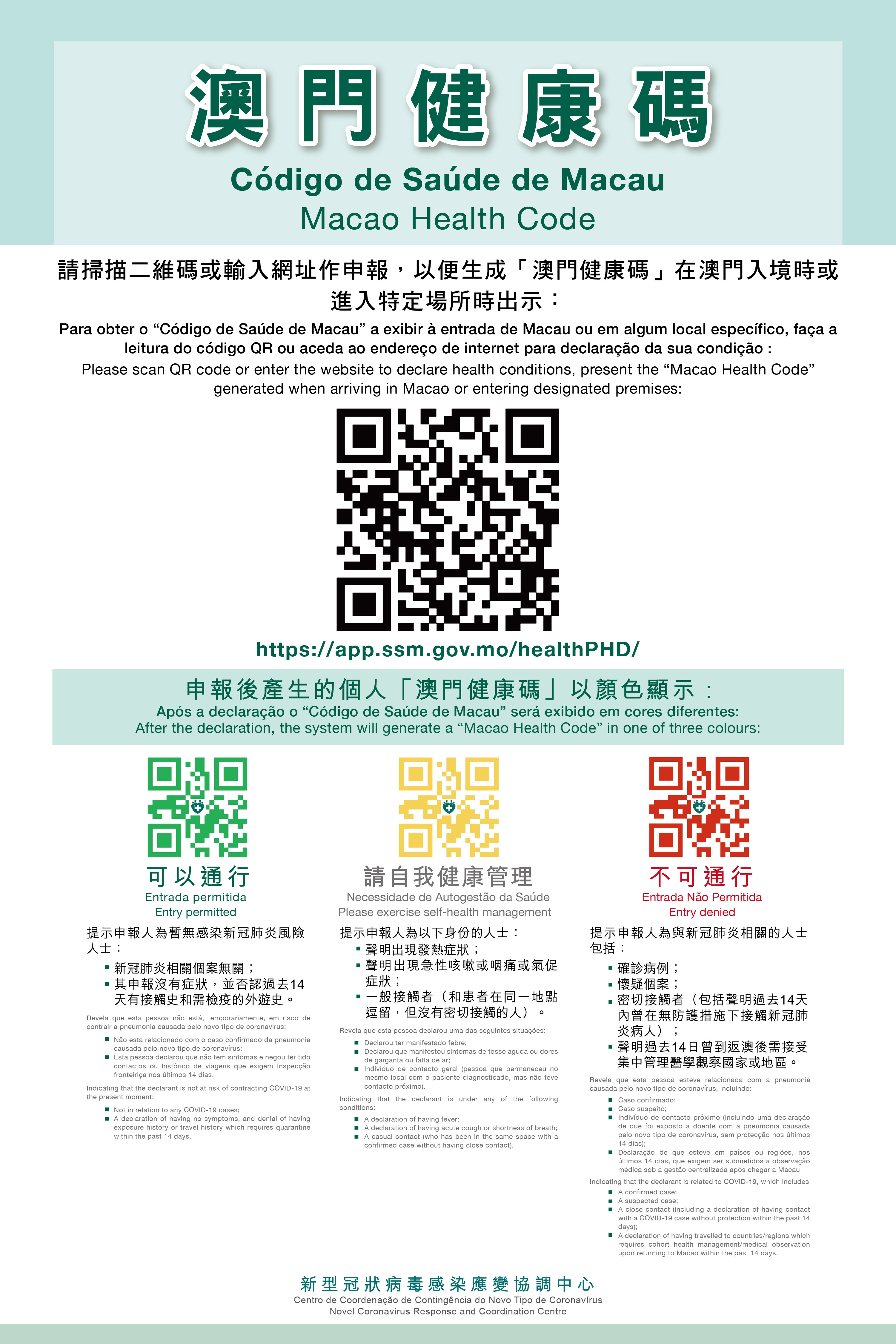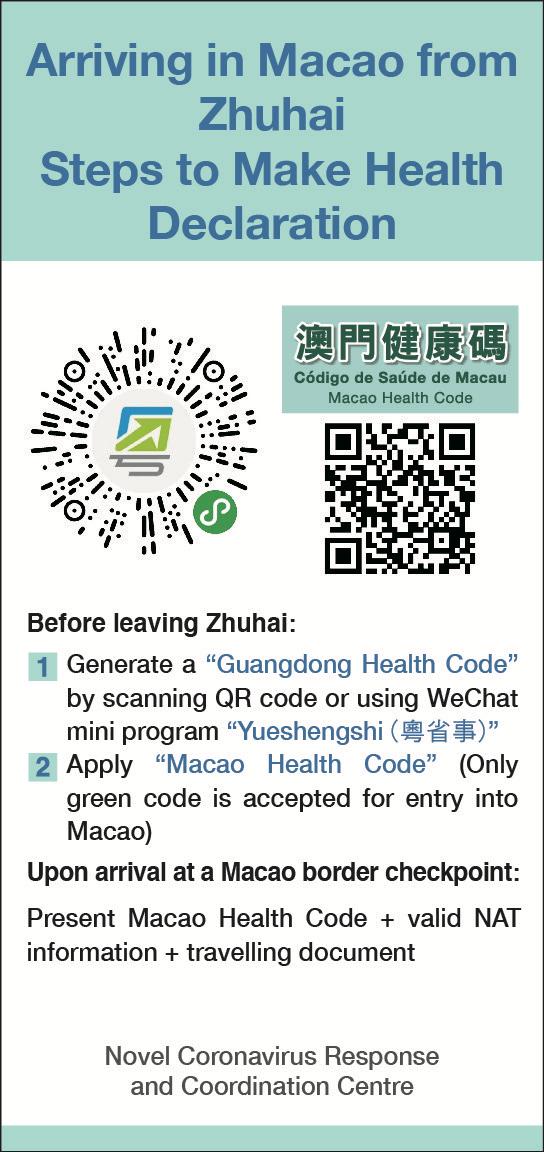 The mutual recognition of health declaration systems does not mean relaxation in existing entry-restriction policies. Holders of the relevant code-form declaration necessary for entry approval, will still not be exempted from the 14-day period of medical observation required when travelling between Macao and Guangdong, unless they also fulfil other prescribed conditions.