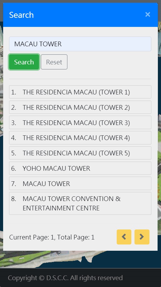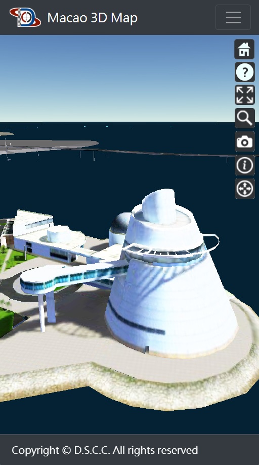 The mobile version of the “Macao 3D Map” is a combination of the technology advantages of the mobile device, multi-touch technology, and the cloud application, which simplifies the operations of 3D map in conjunction with delicate and detailed 3D models of all buildings in Macao. The public can browse the scenes of 3D map through their mobile phones or tablet devices. The “Macao 3D Map” is easy to operate and provides map operations including zooming in, zooming out, rotating and panning, as well as many practical functions such as search functions for building names, browsing preset 3D scenic spot, and clicking on the 3D model to obtain the building name.