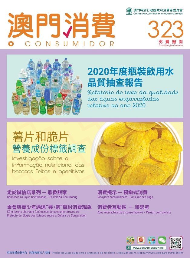 The newly published issue no. 323 Consumer Report features two reports on the quality of bottled water, and nutrition facts label of chips and crisps. Consumers may check the reports on the Consumer Council’s website ( www.consumer.gov.mo ) or WeChat account.