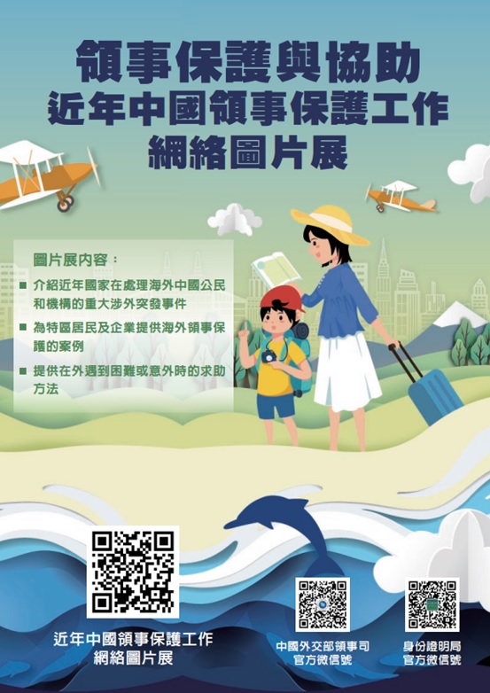 In order to deepen the knowledge of Macao residents on consular protection and service provided by the Ministry of Foreign Affairs of China for overseas Chinese citizens, and increase their understanding of the risk to overseas safety so as to raise the awareness of safety precaution and self-protection, the Identification Services Bureau launched the “Consular Protection and Assistance – Works on Consular Protection of China in Recent Years” online photo exhibition on 14th August 2020 under the guidance of the Office of the Commissioner of the Ministry of Foreign Affairs of the People’s Republic of China in the Macao SAR.