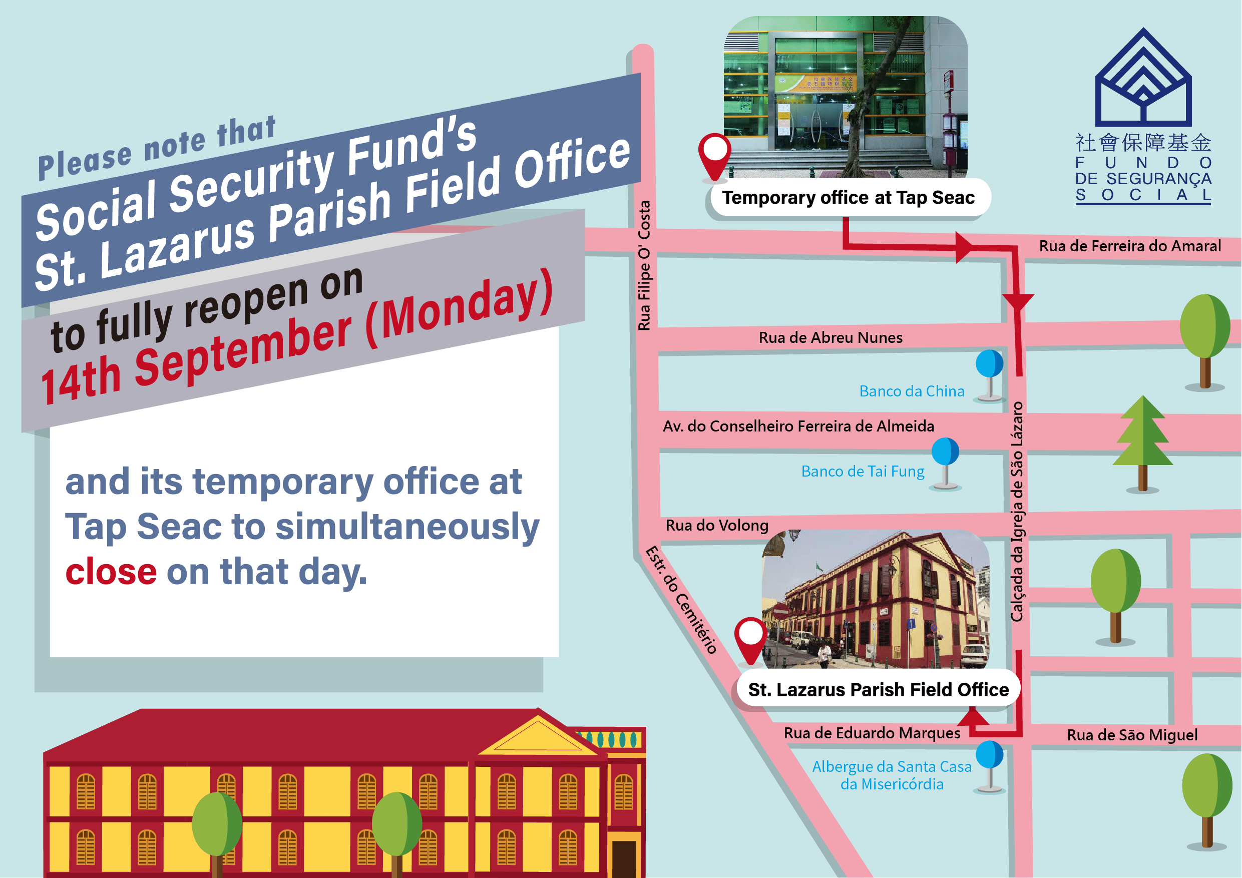 The Social Security Fund (abbreviated to FSS in Macao) said that St. Lazarus Parish Field Office had now reopened, and the temporary office at Tap Seac had closed simultaneously. Members of the public who want to go there for the services of FSS should pay attention to this.