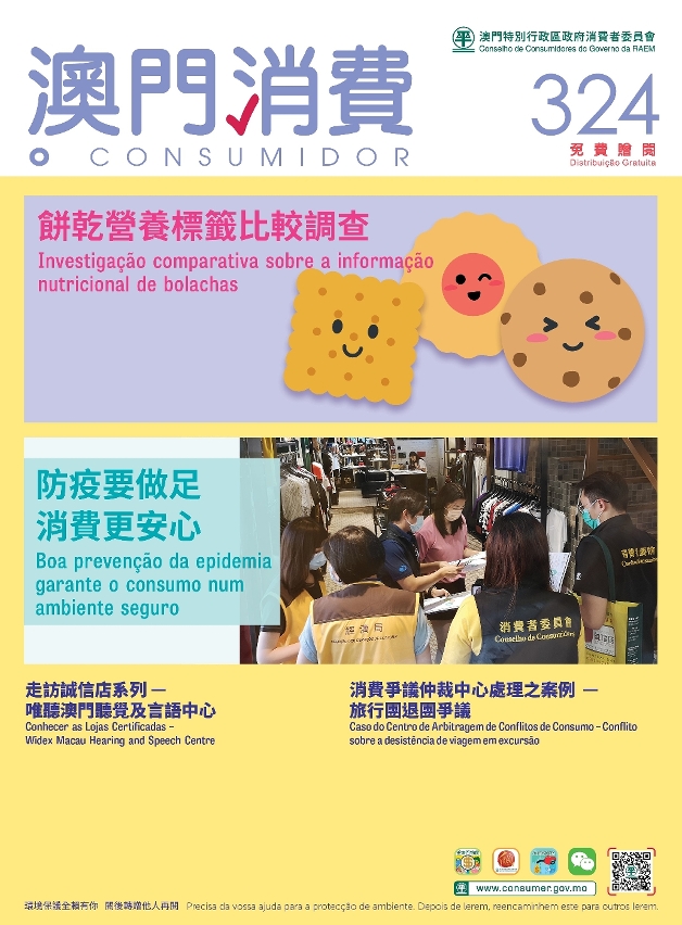 Consumers may access the magazine on the Council’s official website and WeChat official account. Consumer Report is also available free of charge at the Council (Av. Horta e Costa, N.º 26, Edf. Clementina Ho), and the service counter of the Council at Macao SAR Government Service Centre (Rua Nova da Areia Preta, Nº52), Public Information Centre at Vicky Plaza, libraries, and bookstores.