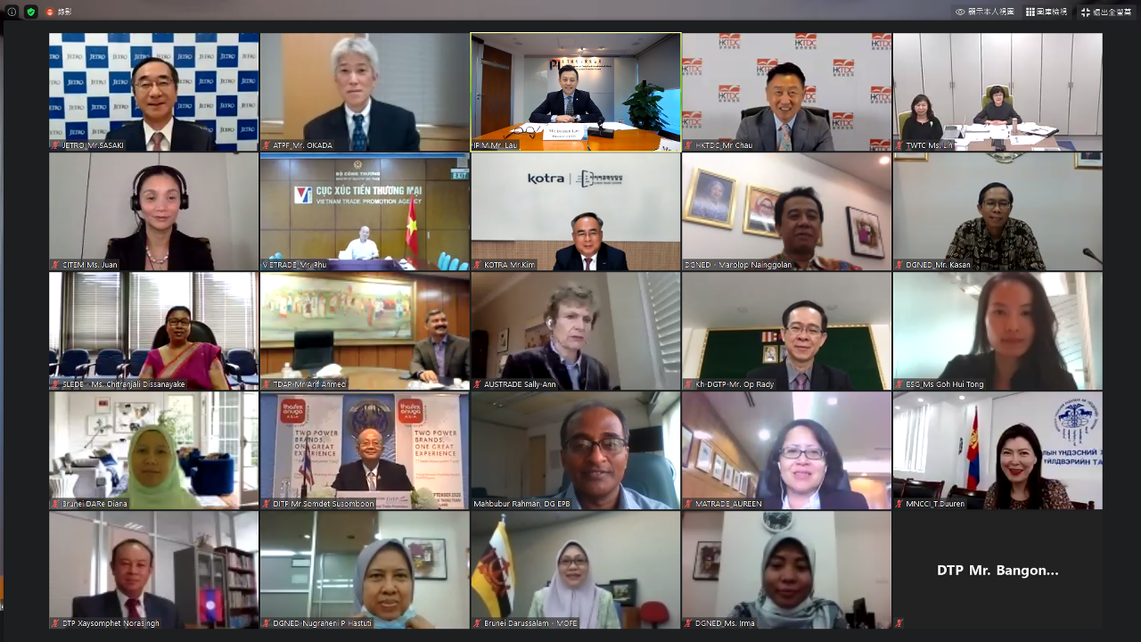 Representatives of trade promotion entities from 20 Asian economies, including Australia, Bangladesh, Brunei, Cambodia, Mainland China, Hong Kong, Indonesia, Japan, Laos, Macao, Malaysia, Mongolia, Pakistan, the Philippines, Singapore, Sri Lanka, South Korea, Thailand, Taiwan and Vietnam participated in the ATPF this year. In particular, Vice Chairman of China Council for the Promotion of International Trade (CCPIT) Zhang Shaogang, Deputy Executive Director of Hong Kong Trade Development Council (HKTDC) Benjamin Chau also took part in this online meeting.
