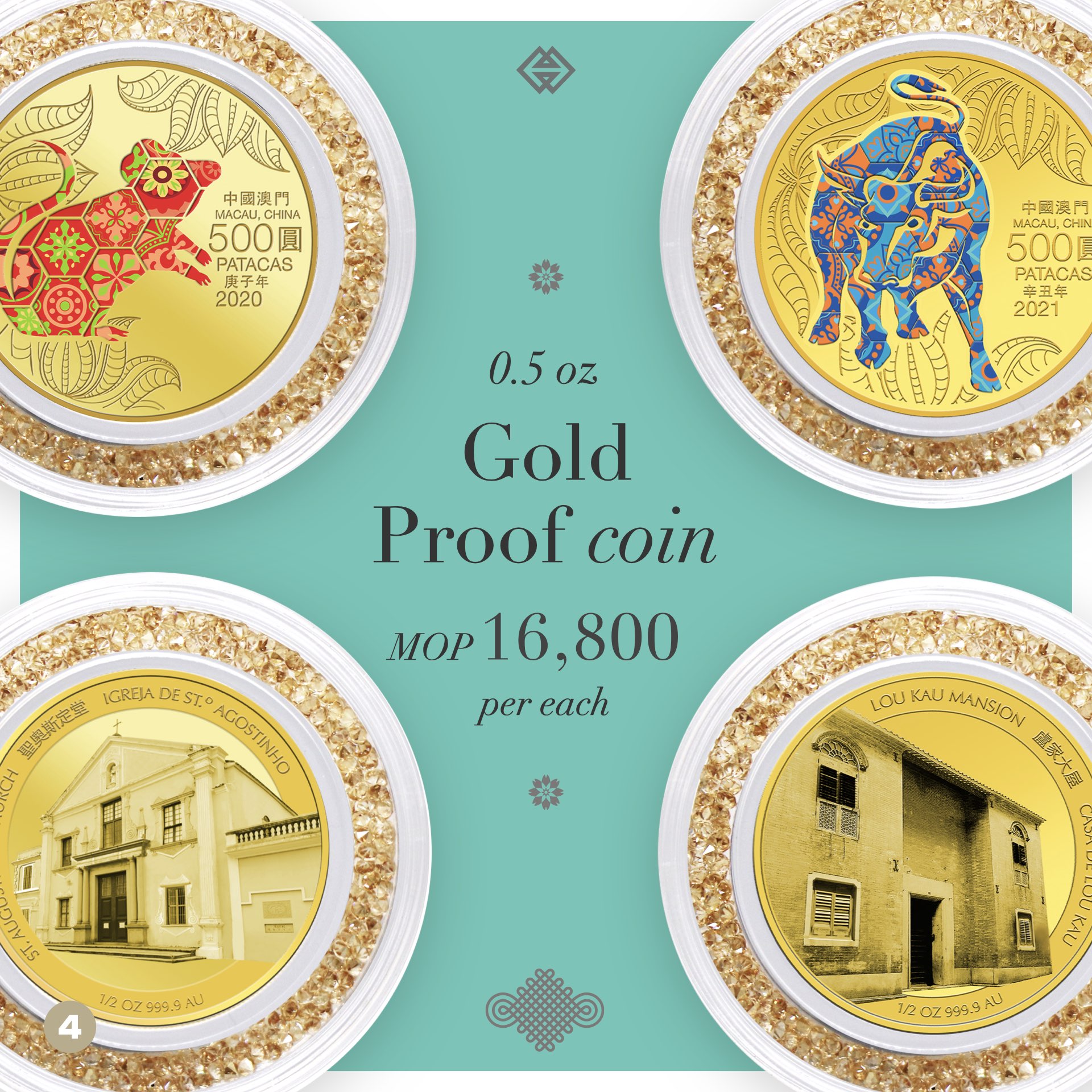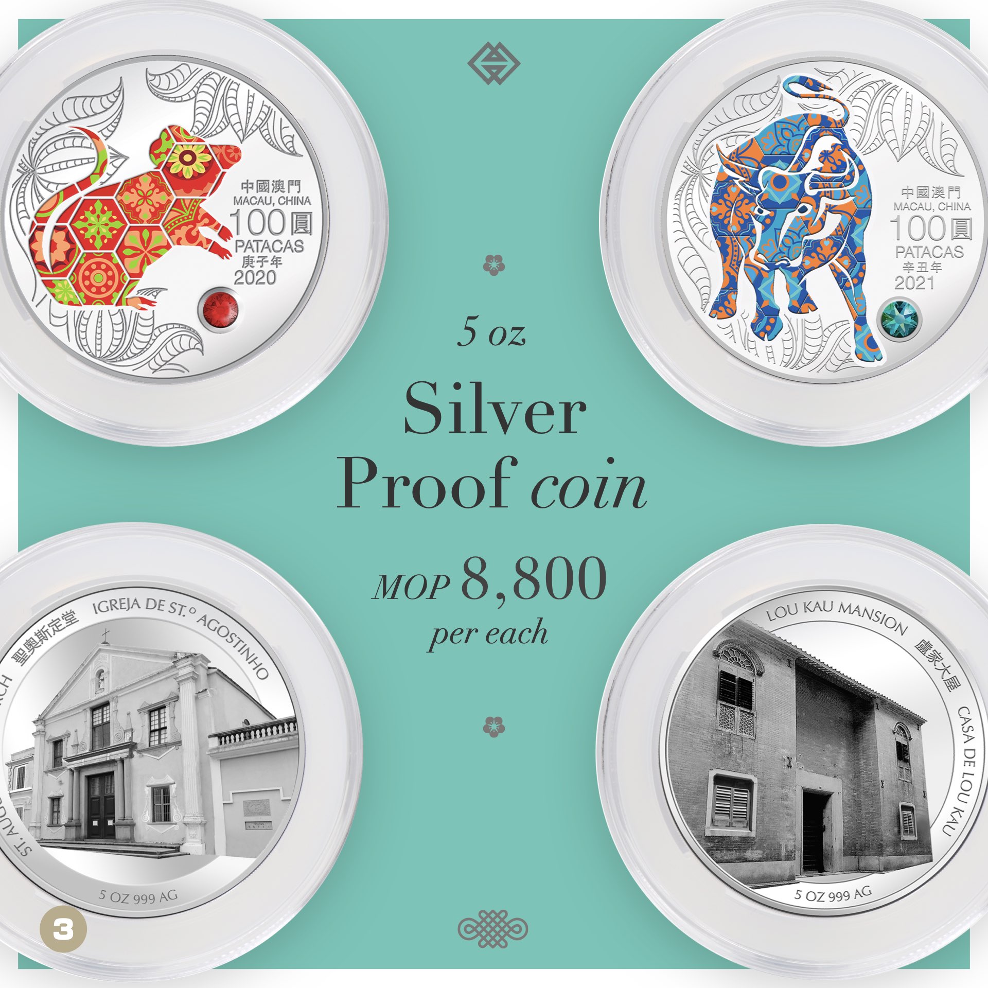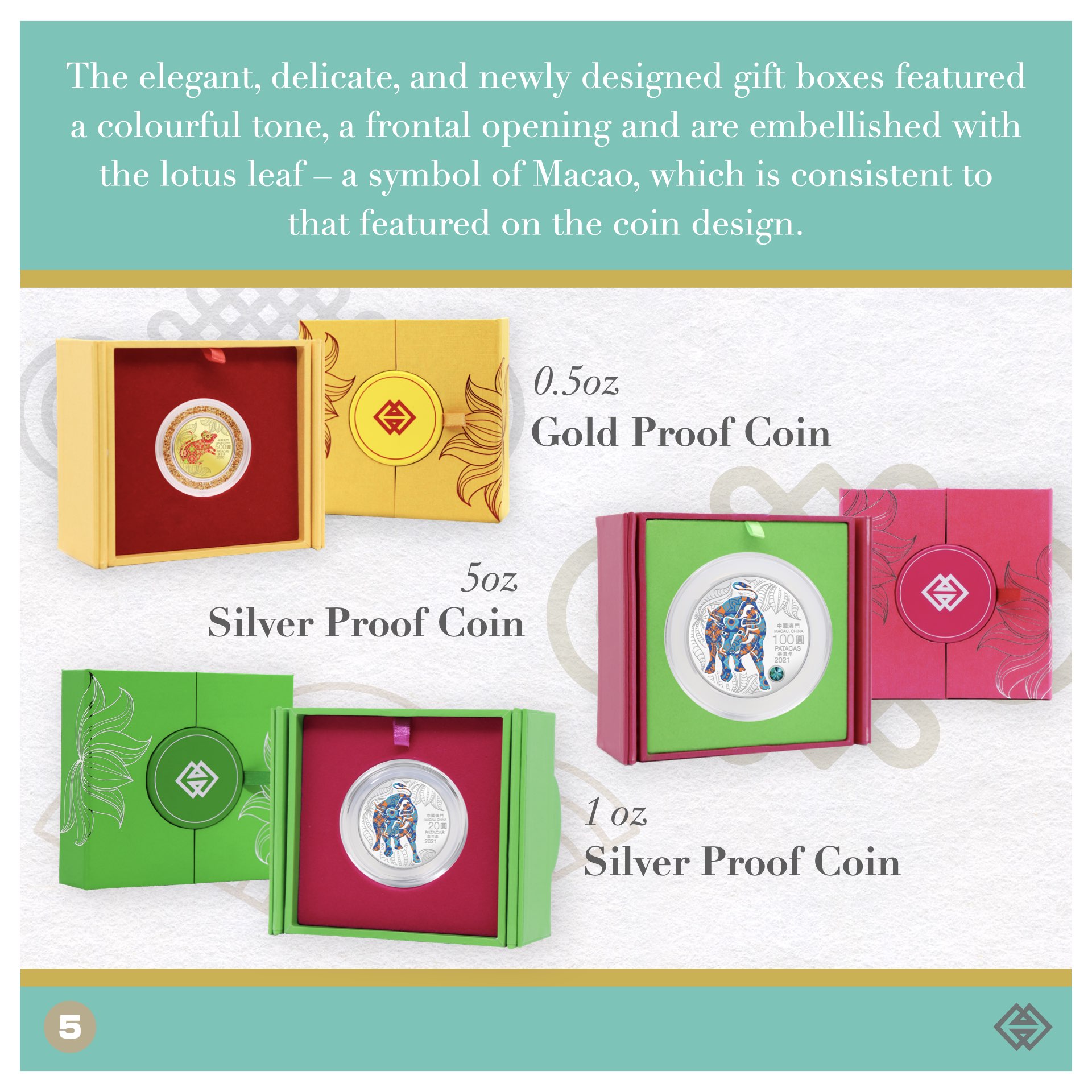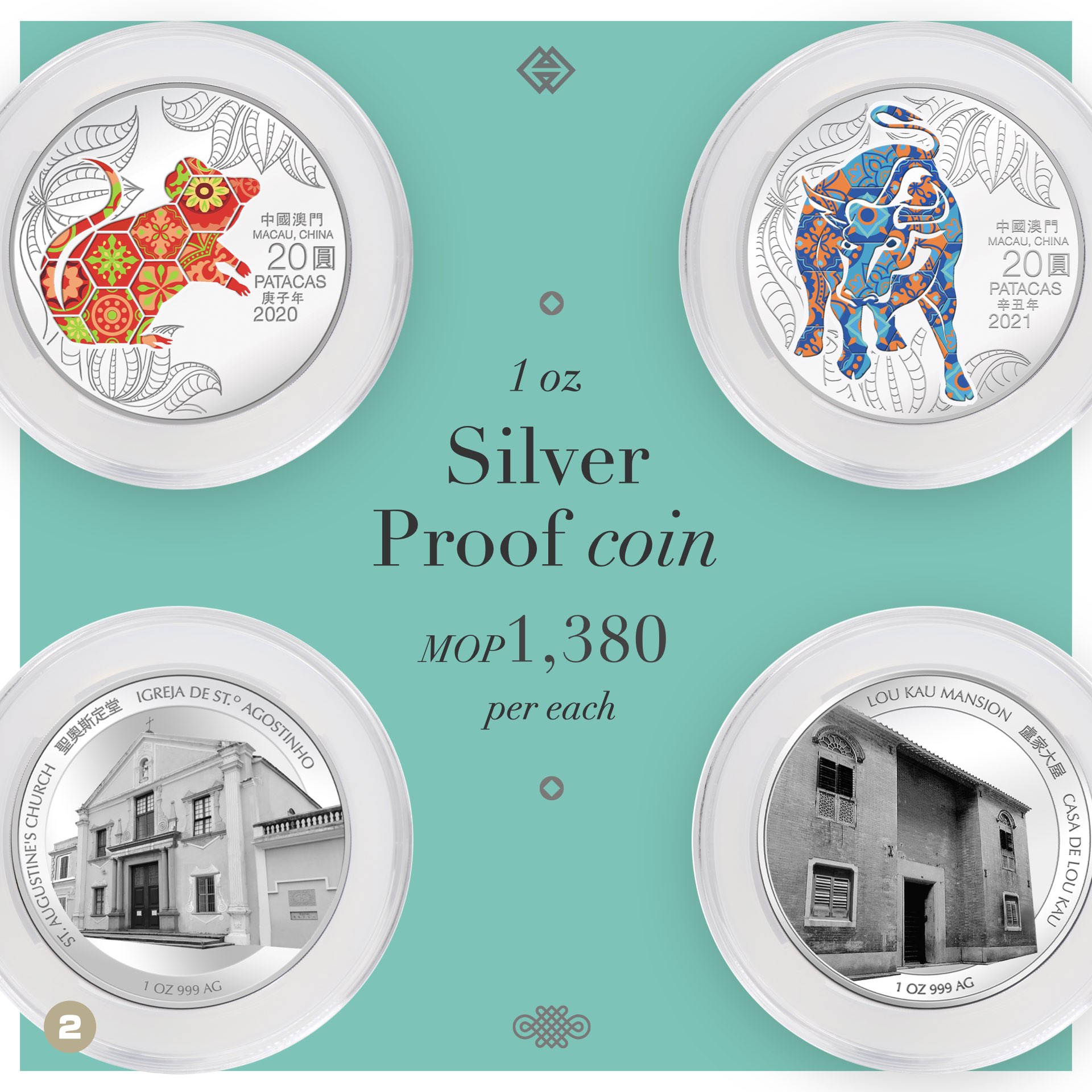This new series of Lunar New Year commemorative coins adopts a new design. The obverse design features the outline of the Chinese Zodiac sign, portrayed with a vibrant display of the distinctive Portuguese-inspired patterned tiles. The reverse design features World Heritage Sites of Macao by angular side perspective presentation, sculpted in the latest angular high relief minting technique. Similar to the last series, the Year of the Rat and the Year of the Ox commemorative coins comprise 1 oz and 5 oz Silver Proof coin with the selling price of MOP1,380 and MOP8,800 respectively, while for the Gold Proof coin, its weight is increased from 0.25 oz in the last series to 0.5oz and its selling price is MOP16,800.
