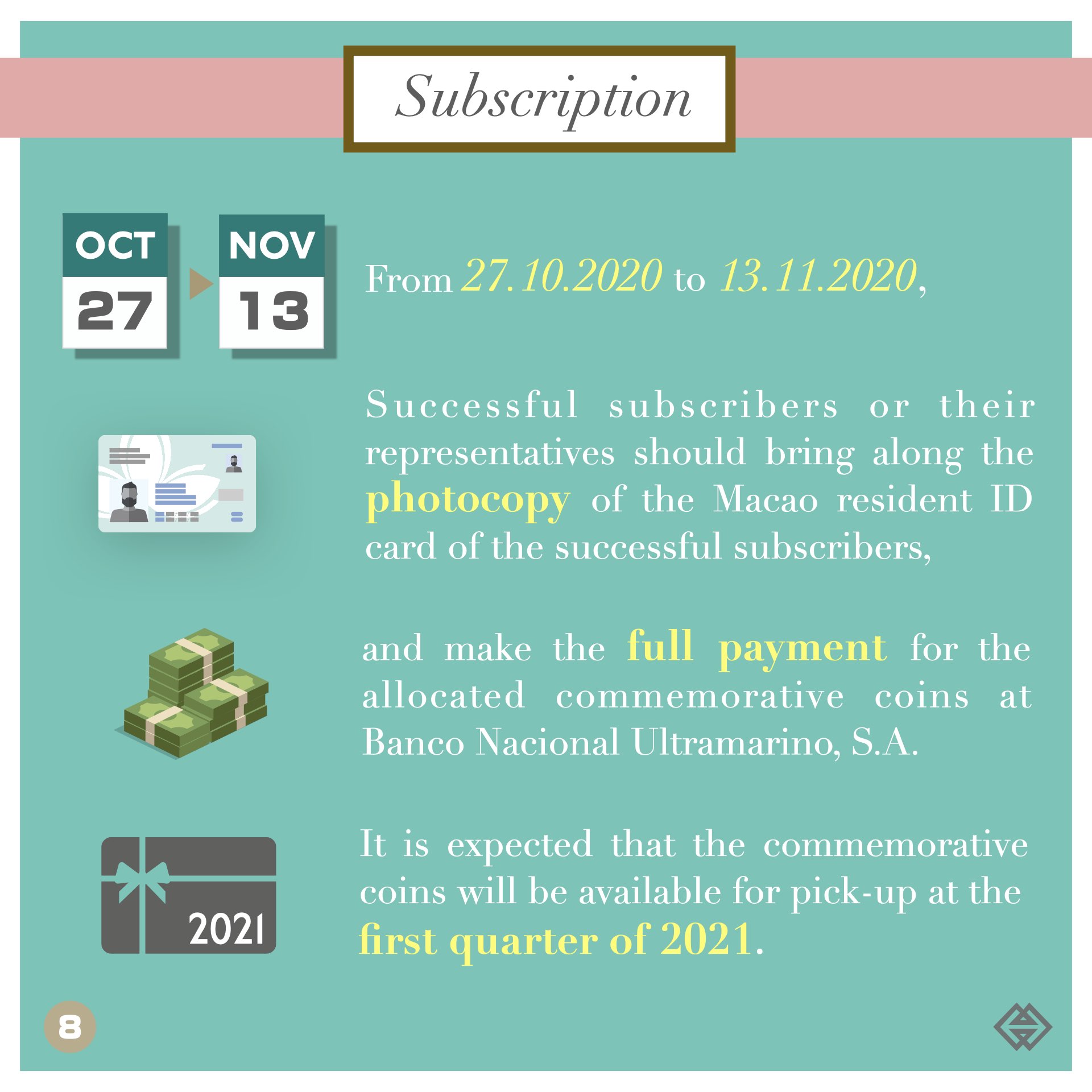 Successful subscribers or their representatives should bring along the photocopy of the Macao resident identity card of the successful subscribers and make the full payment for the allocated commemorative coins at Banco Nacional Ultramarino, S.A. from 27 October 2020 to 13 November 2020. It is expected that the commemorative coins will be available for pick-up at the first quarter of 2021.