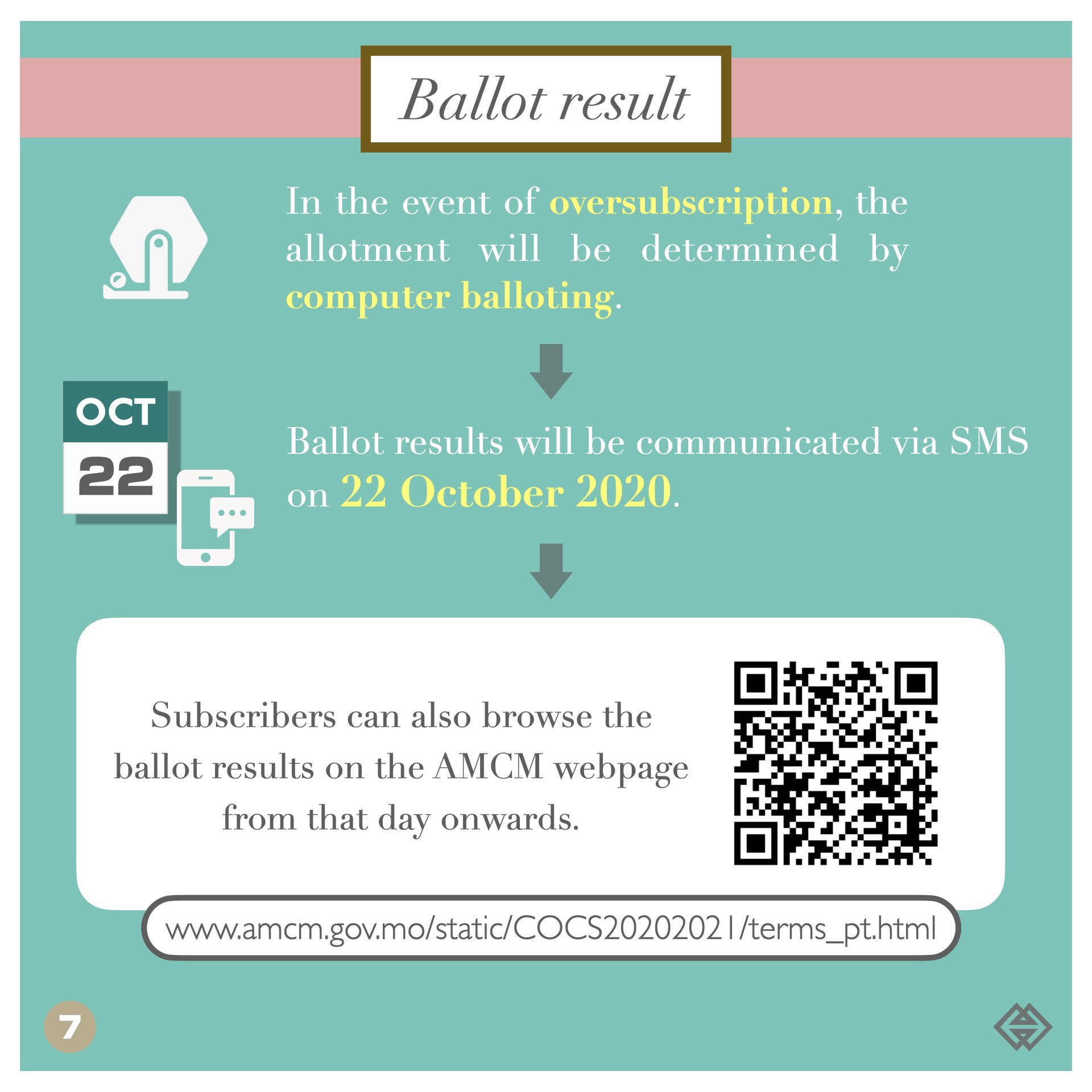 Each subscriber can only conduct a single subscription, for a maximum of one piece for each of the six said commemorative coins. In the event of oversubscription, the allotment for each type of commemorative coins will be determined by computer balloting. Ballot results will be communicated via SMS messages on 22 October 2020. Subscribers can also browse the ballot results on AMCM webpage ( https://www.amcm.gov.mo/static/COCS20202021/terms_pt.html ) from that day onwards.