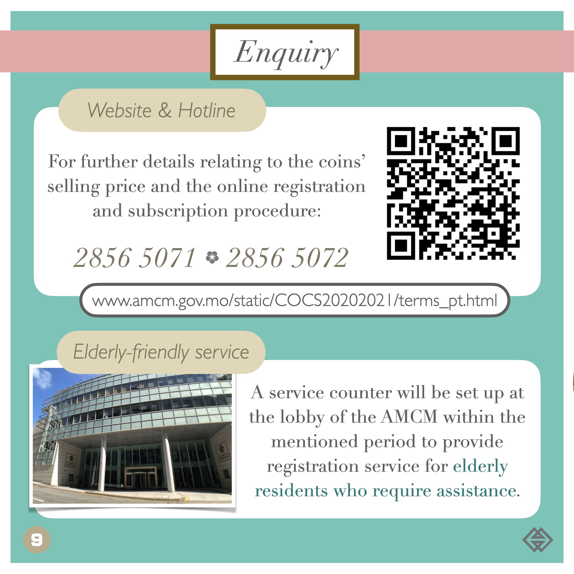 For further details relating to the coins’ selling price and the online registration and subscription procedures, please refer to our webpage ( https://www.amcm.gov.mo/static/COCS20202021/terms_pt.html ) or call 28565071/28565072.