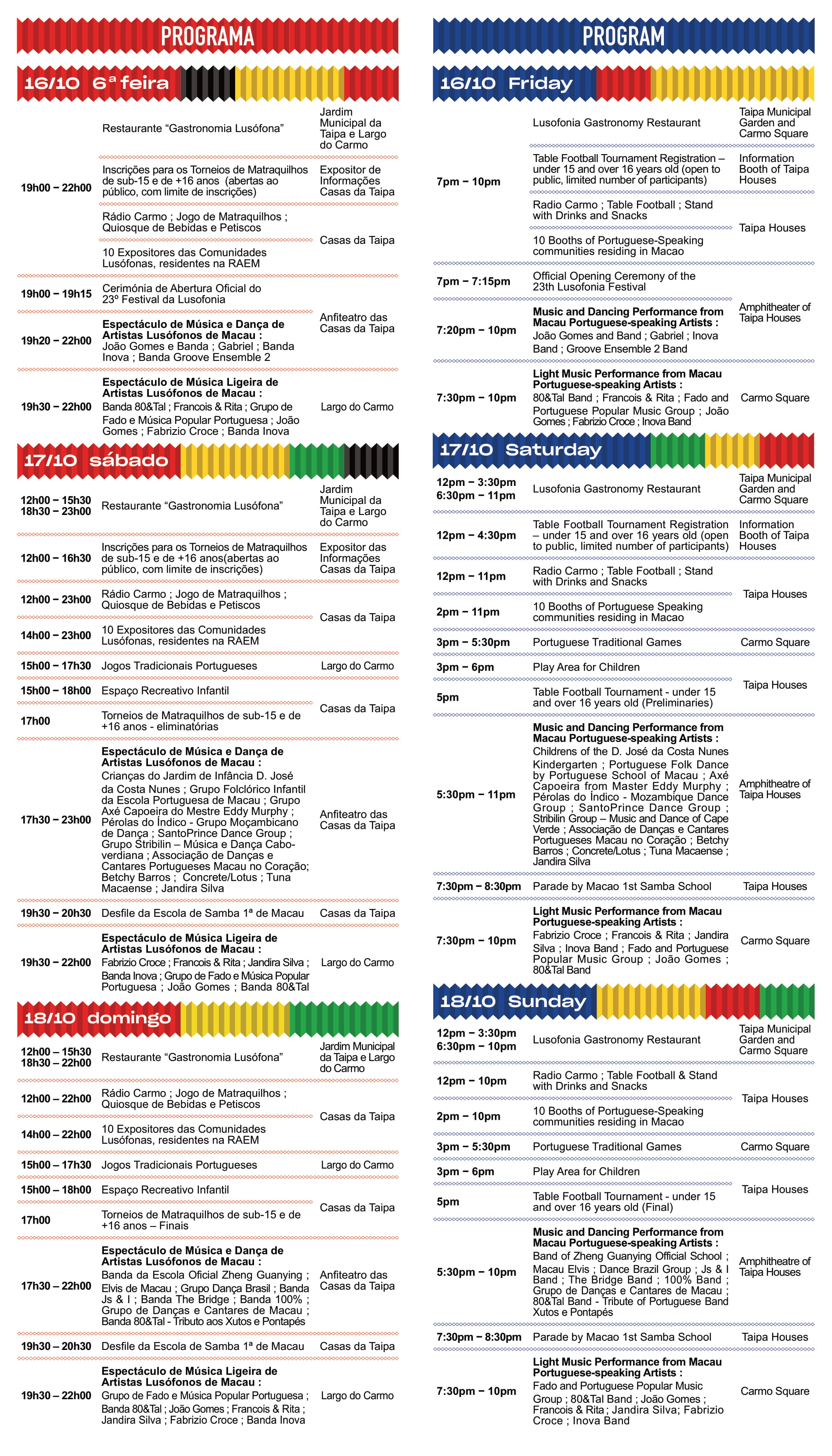 In each day of the Festival, local Portuguese-speaking artists will perform different styles of music and dance on the main stage of the Festival and soft music on the stage installed in Carmo Square. In addition, the Festival temporary restaurant will serve Portuguese dishes at lunch and dinner time, namely typical Portuguese grilled food and specialties of the various participating Portuguese-speaking countries and regions. There will also be a kiosk installed in the venue serving typical Portuguese snacks and drinks. Furthermore, visitors of all ages can participate in traditional Portuguese games, including wooden ski run, rope pulling and others which will be held at Carmo Square on Saturday and Sunday afternoon. Winners will receive bottles of wine, codfish, canned sardines and Portuguese sausage. Also, there will be table football tournaments. Teams consisting of two participants of two different categories, 16 years old and above and under 15, can enrol until 4:30pm on Saturday. During the afternoon of Saturday and Sunday, a leisure space for children featuring diversified games, puppet shows and face painting will be provided. The temporary "Radio Carmo" station will be installed on site broadcasting lusophone music throughout the Festival, plus broadcasting interviews with the public.
