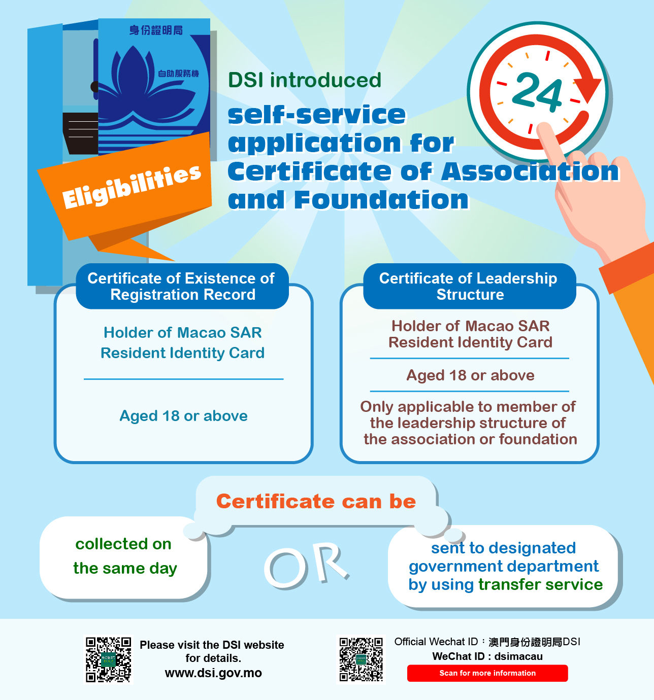 For enquiries,please call DSI at 2837-0777 or 2837-0888 or email to info@dsi.gov.mo.
