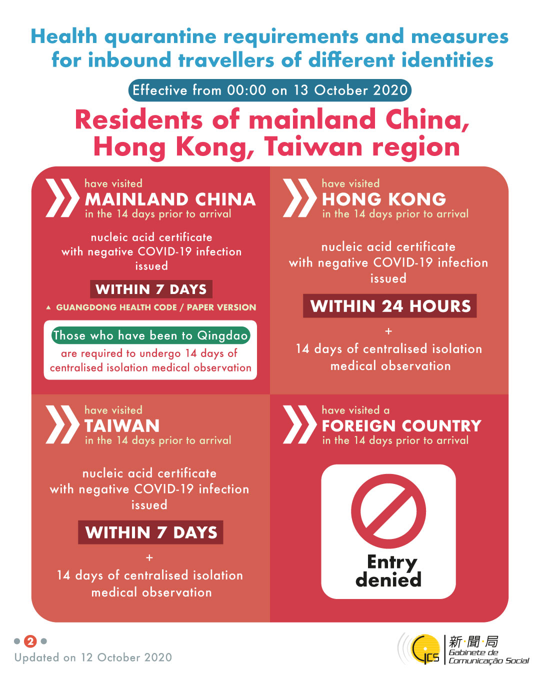 Health quarantine requirements and measures for inbound travellers of different identities, updated on 12 October 2020.