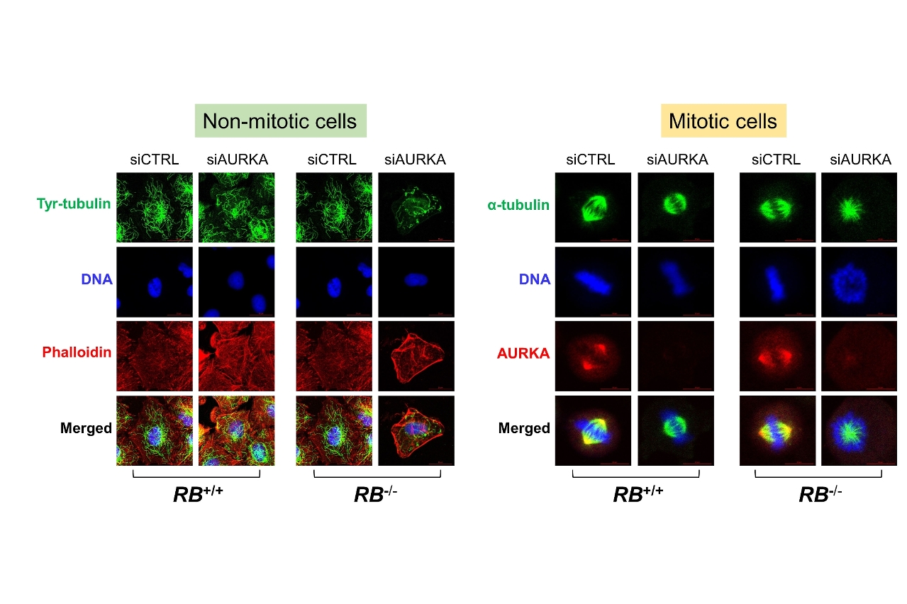 Through molecular-level and genome-wide studies, the team found that RB1 loss highly increased the expression of the microtubule destabilizer STMN1 in SCLC. The activity of the high level of STMN1 was largely suppressed by AURKA through inhibitory phosphorylation. Inhibiting the AURKA activity in the cells turned this potential weapon (STMN1) into the active form and strongly disrupted microtubule dynamics in RB1-mutant SCLC, causing selective mitotic cell death. These results have been further confirmed in experiments with mice. This study demonstrated potential applicability of the pharmacological inhibitors of AURKA and microtubule dynamics for the treatment of patients with SCLC.