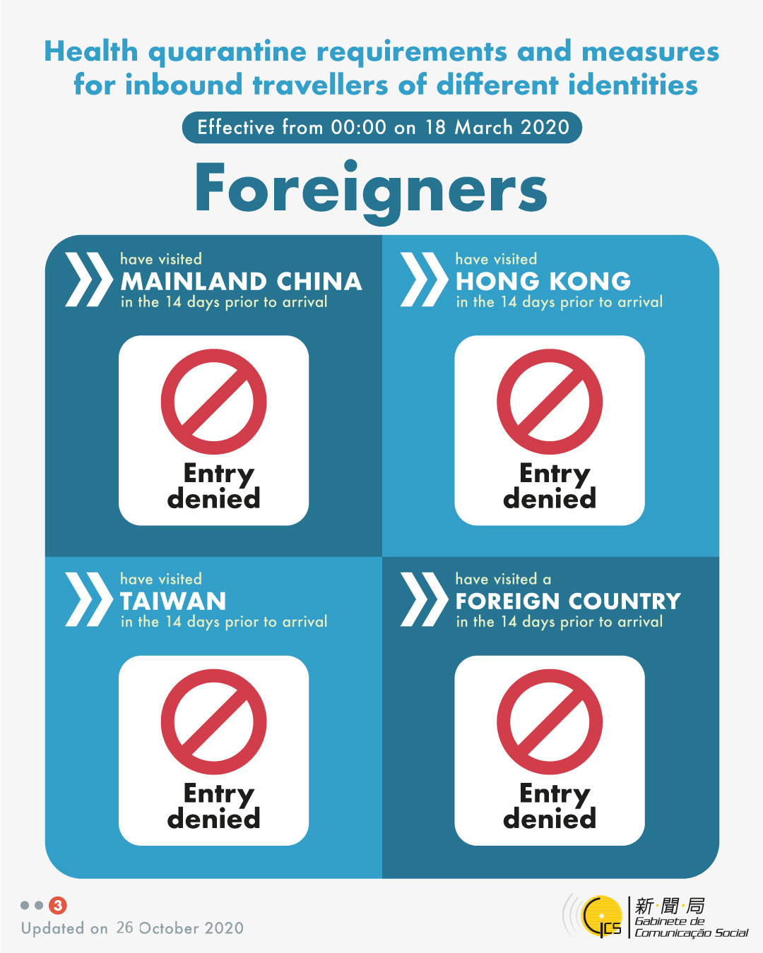 Health quarantine requirements and measures for inbound travellers of different identities, updated on 26 October 2020.