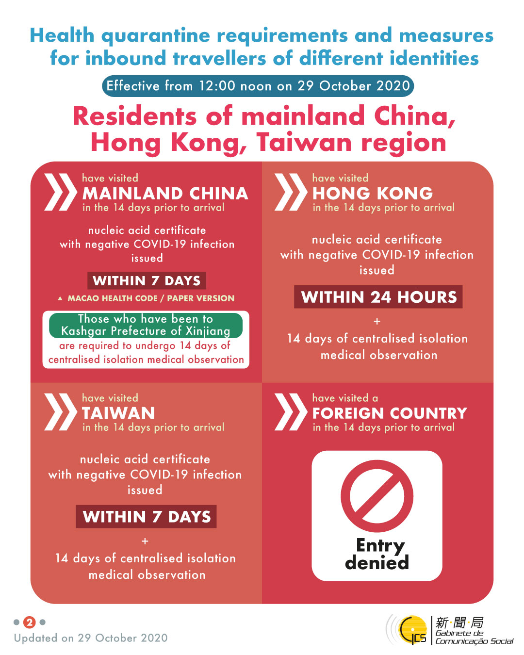 Health quarantine requirements and measures for inbound travellers of different identities, updated on 29 October 2020.