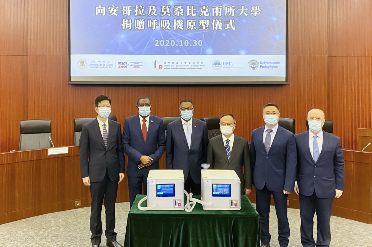 The University of Macau (UM) and the Institute for the Development and Quality, Macau (IDQ-Macau), jointly donated ventilator prototypes to two African universities, namely Mandume ya Ndemufayo University in Angola and Pedagogical University in Mozambique. The donation ceremony was held at UM, where the consuls general of Angola and Mozambique in Macao, namely Dr Eduardo Galiano and Dr Rafael Marques, received the donated ventilator prototypes on behalf of the two universities.