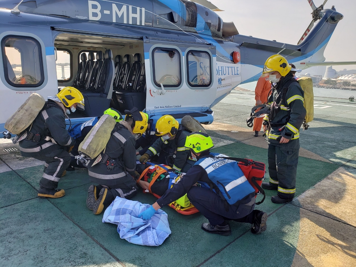 The heliport carried out the full scale emergency exercise this morning to test the capacity of the personnel in handling emergencies and train them with the required skills. The exercise simulated the scenario of a tail rotor drive failure after the helicopter has taken off, the accident of which resulted in a forced heavy landing on the mainpad. All responsible parties activated their contingency plans to resolve the crisis.