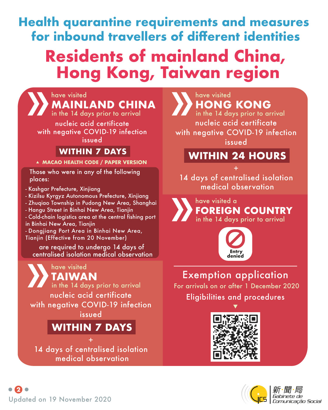Health quarantine requirements and measures for inbound travellers of different identities, updated on 19 November 2020.