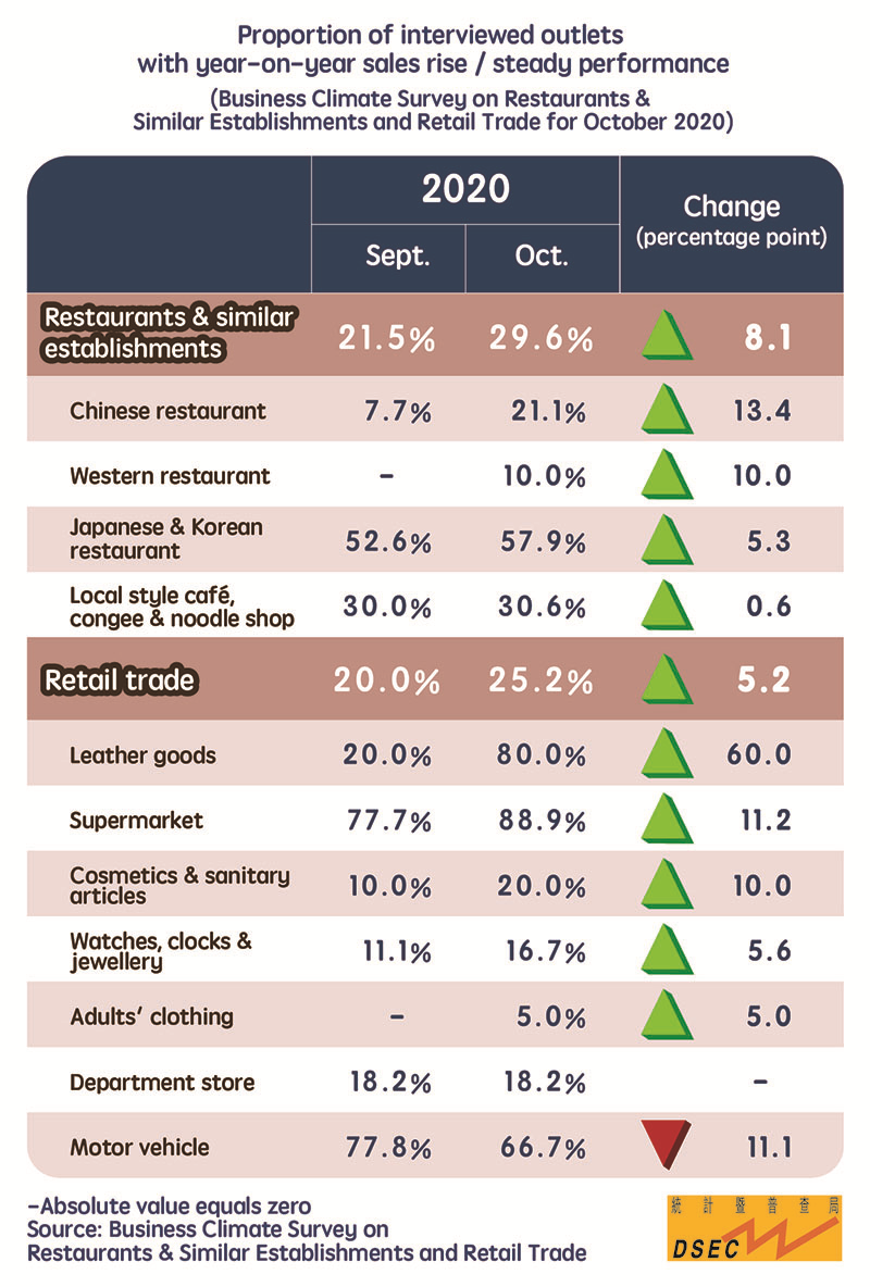 Information from the Statistics and Census Service (DSEC) indicated that there were 30% of the interviewed restaurants & similar establishments recording a year-on-year rise in receipts or steady performance in October, an increase of 8 percentage points from September. The corresponding proportions for all types of establishments showed increases as compared to the previous month, with the shares of Chinese Restaurants (21%) and Western Restaurants (10%) rising by 13 percentage points and 10 percentage points respectively. On the other hand, 70% of the interviewed establishments reported a year-on-year decline in receipts in October, a decrease of 8 percentage points from September.